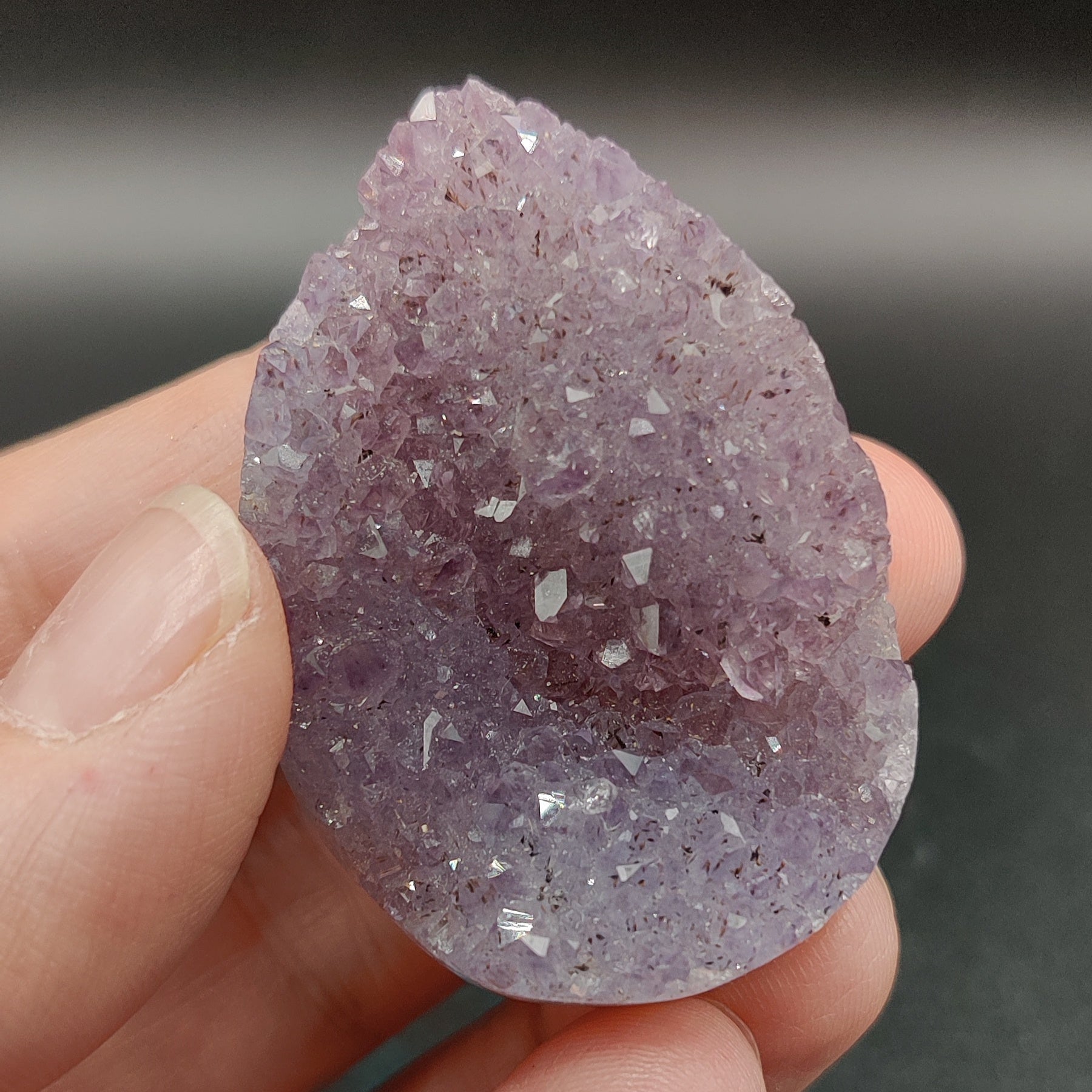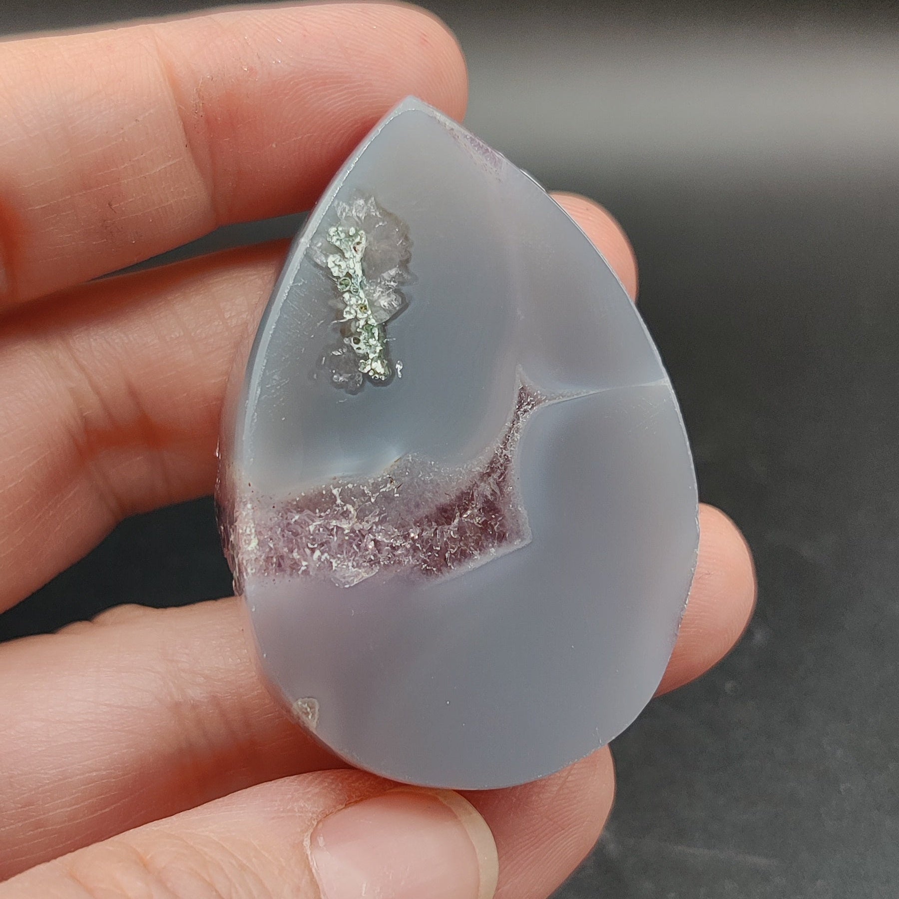 Esta pieza translúcida está tallada en forma de gota, con la parte anterior completa de ágata gris natural, pulida para poder hacer algún montaje en joyería o simplemente para decoración, colección o sanación.