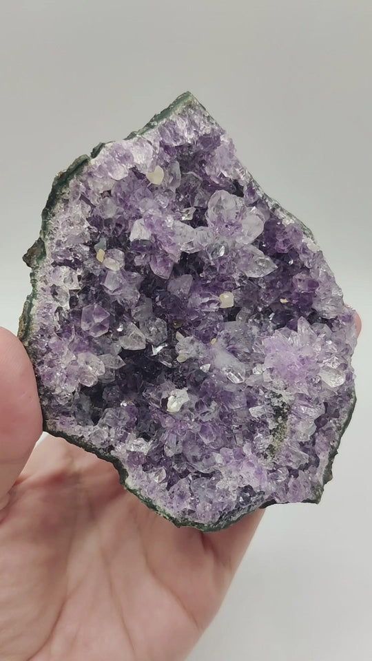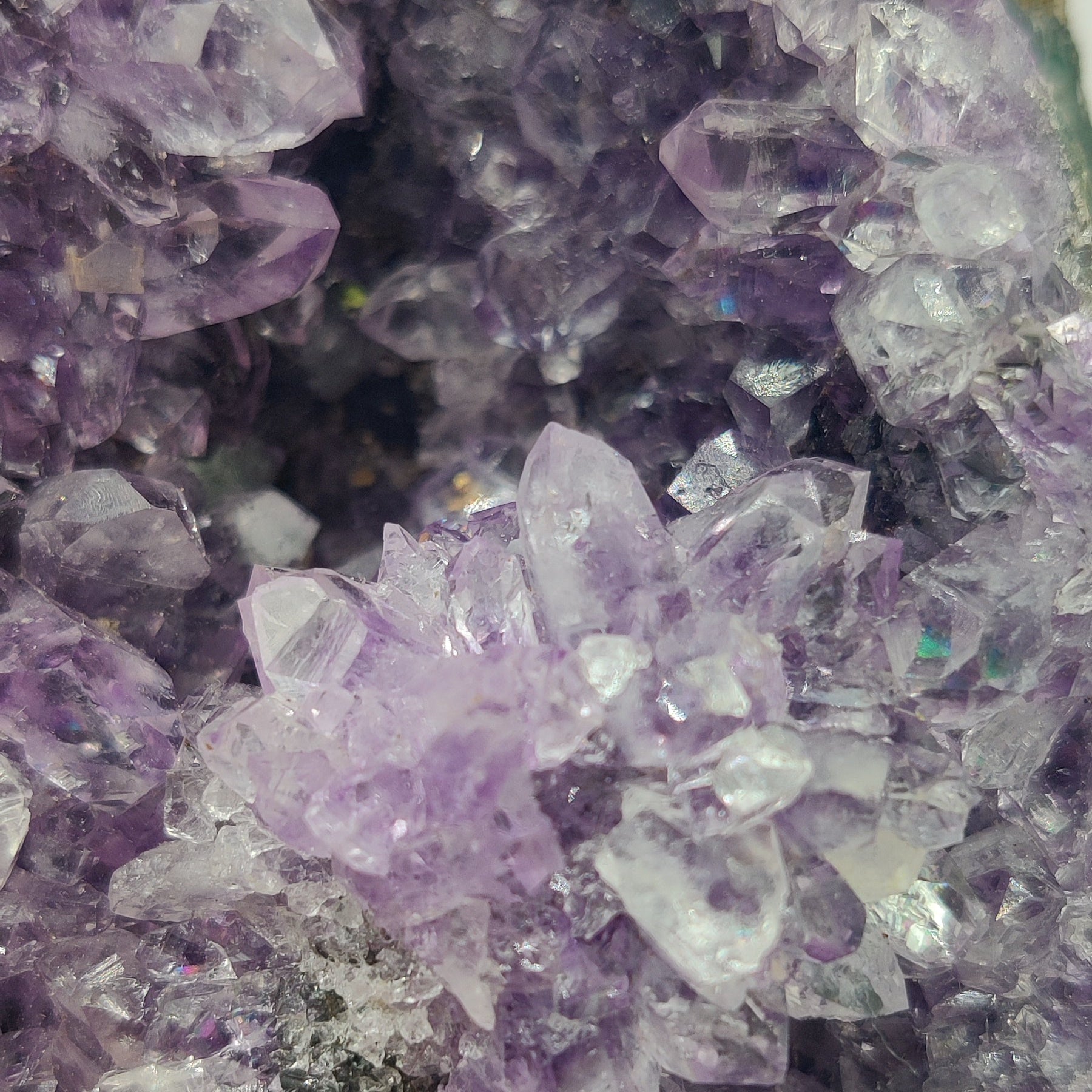 Drusa de amatista con pequeños cristales de calcita, con algunos cristales de amatistas agrupados como piñas. Intenso color y buen brillo.
