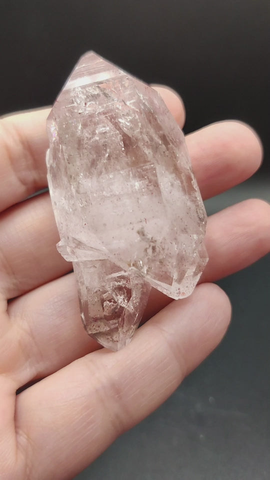 Ejemplar de amatista de color muy sutil, tirando a rosado, con algunos puntos ahumado y numerosas pequeñas inclusiones rojas de mineral de hierro.