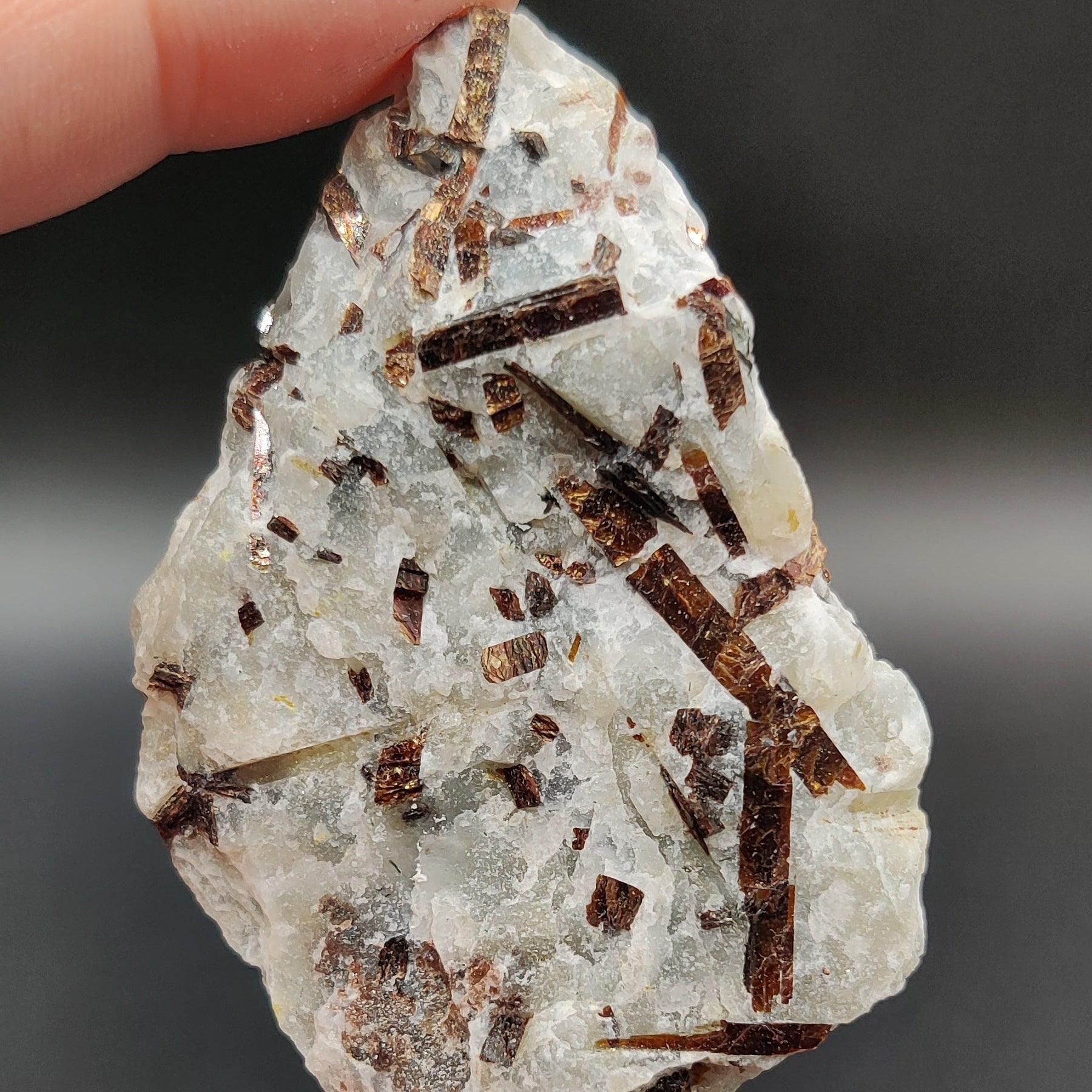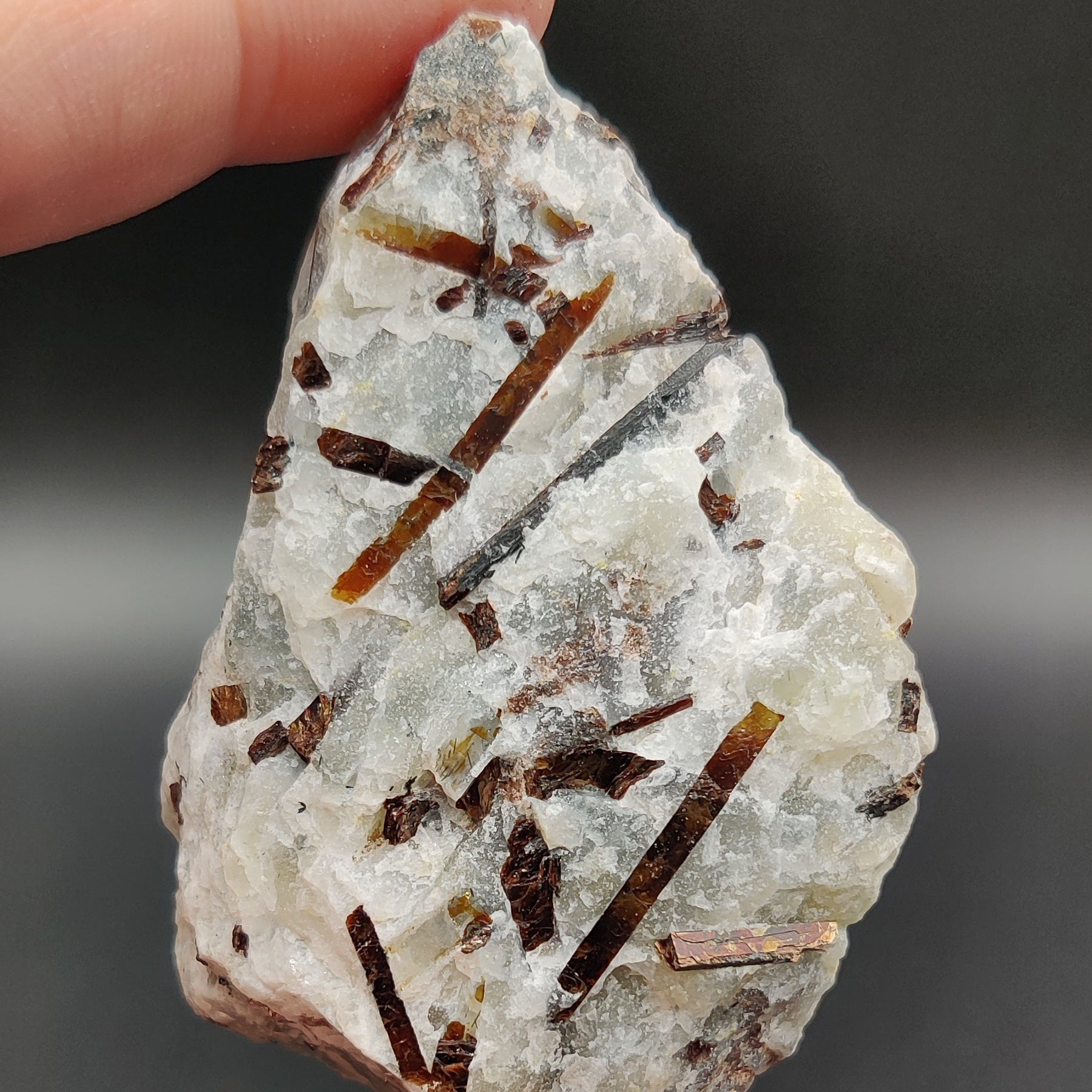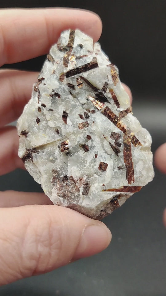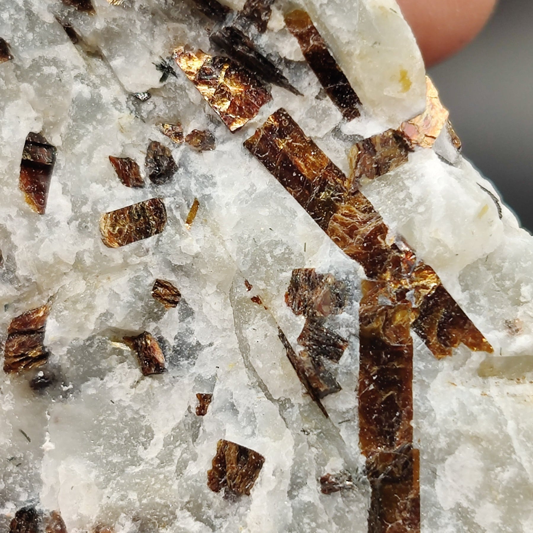 Pieza con matriz blanquecina y varios cristales muy brillantes y bien definidos de astrofilita.