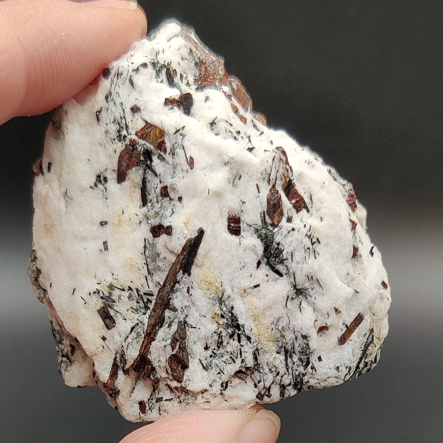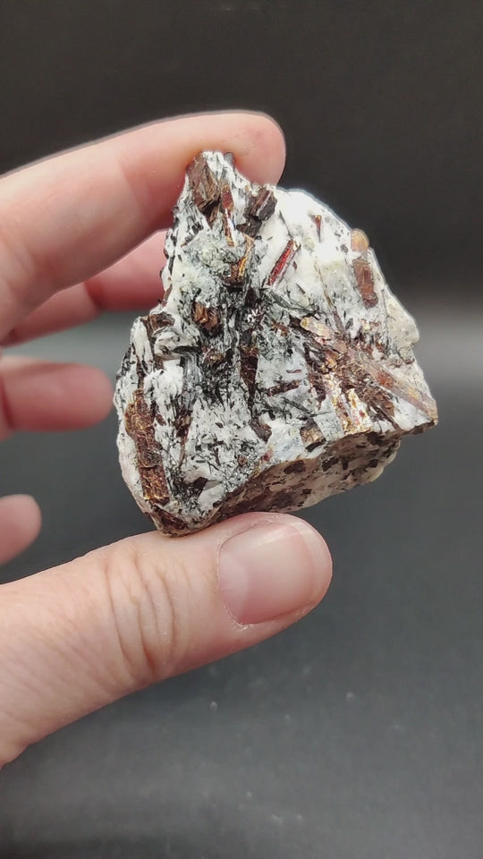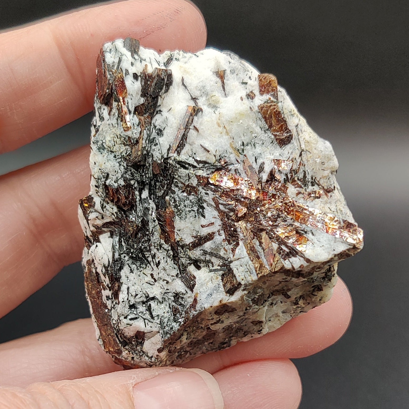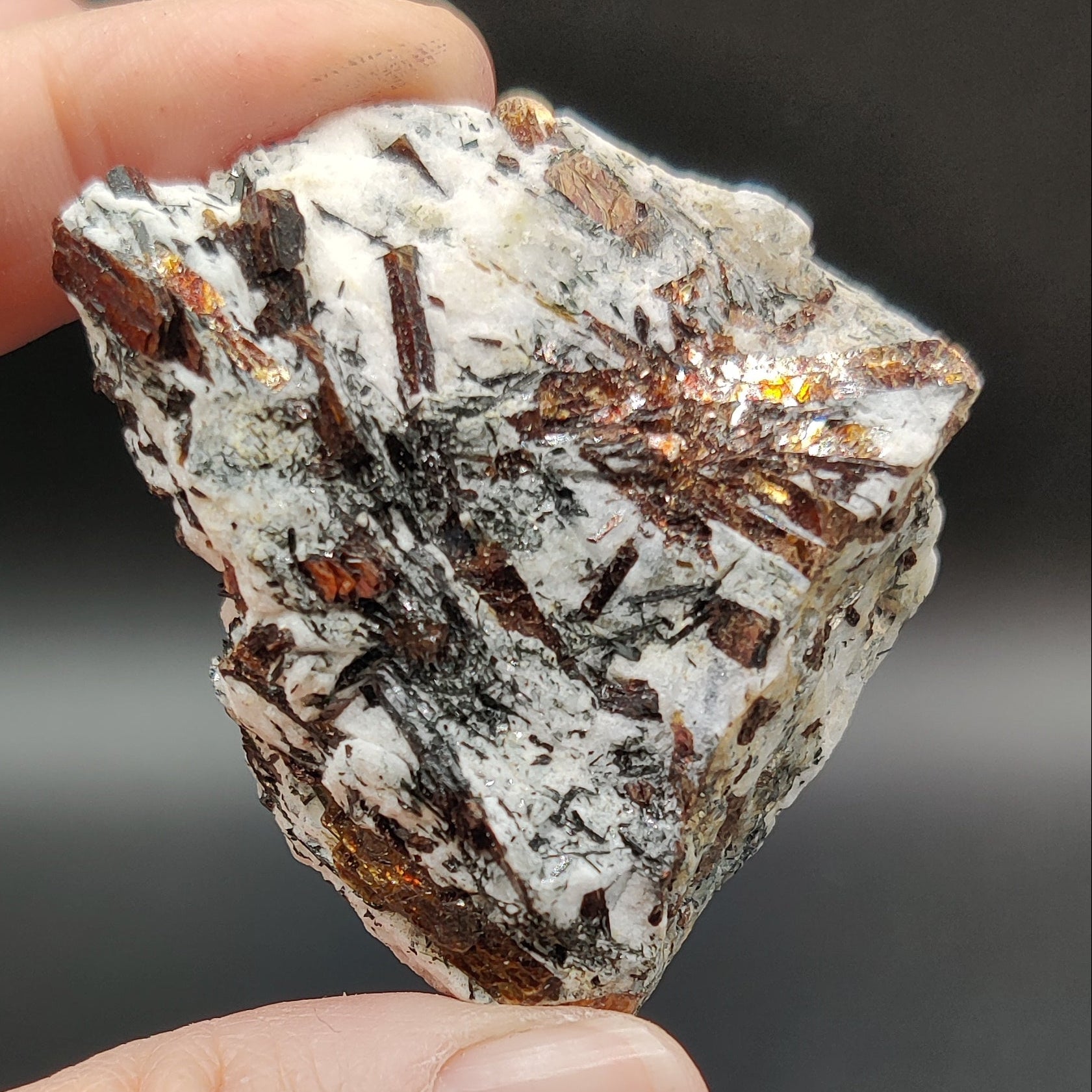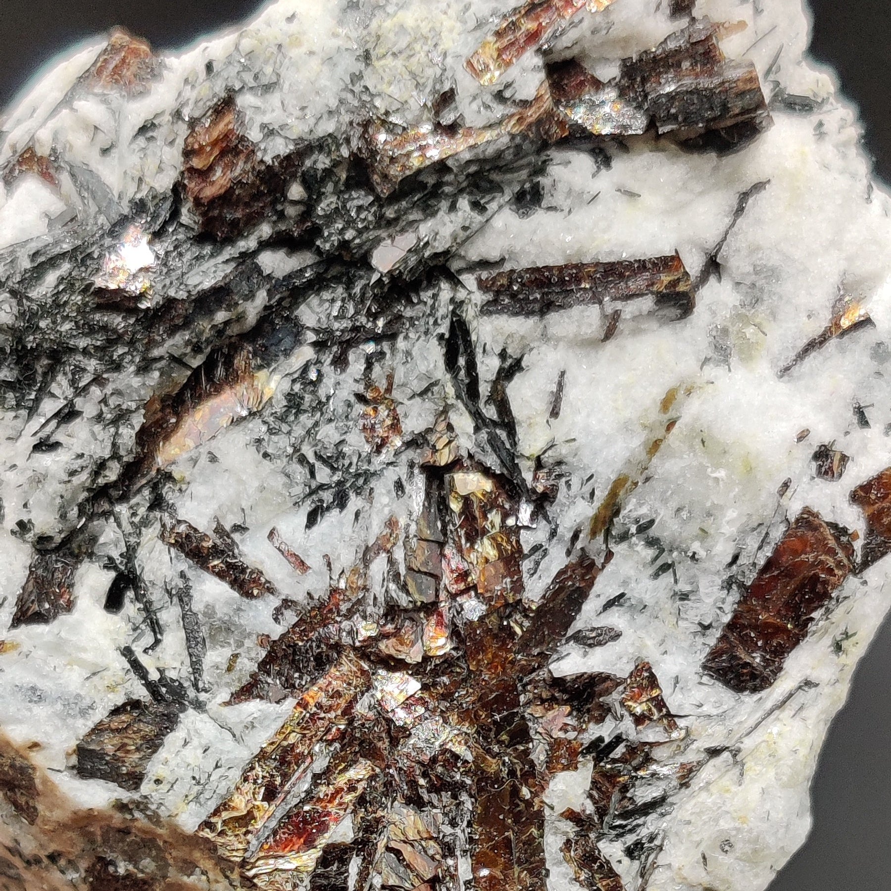 Ejemplar con matriz blanca y numerosos cristales grandes y muy brillantes bien definidos de astrofilita.