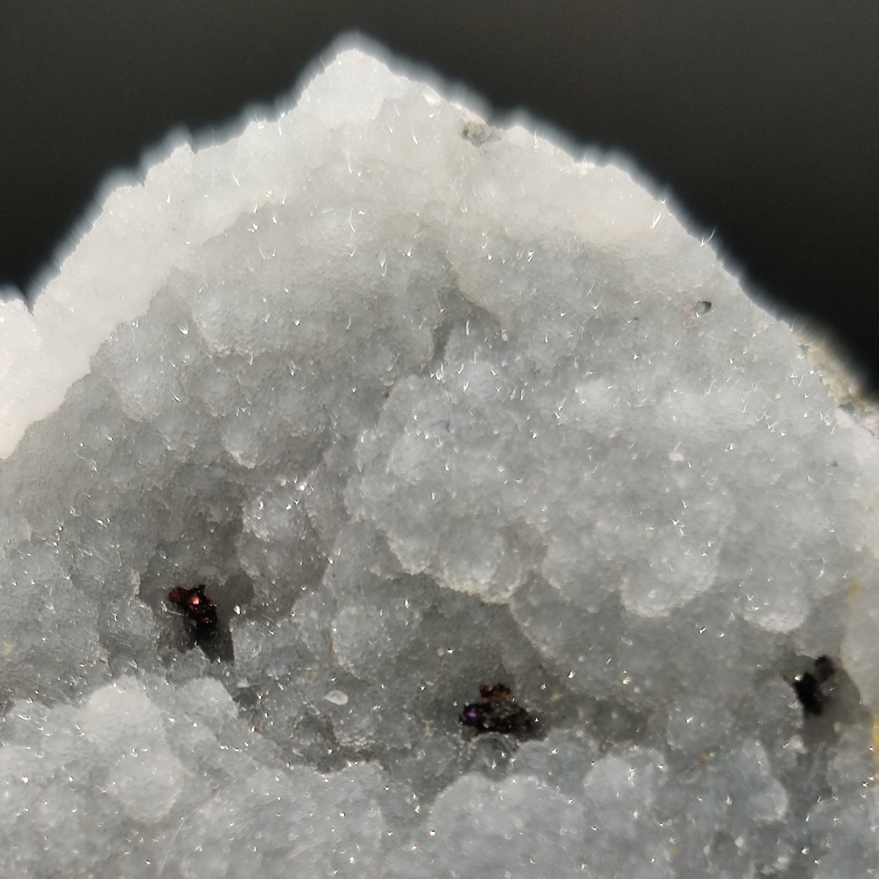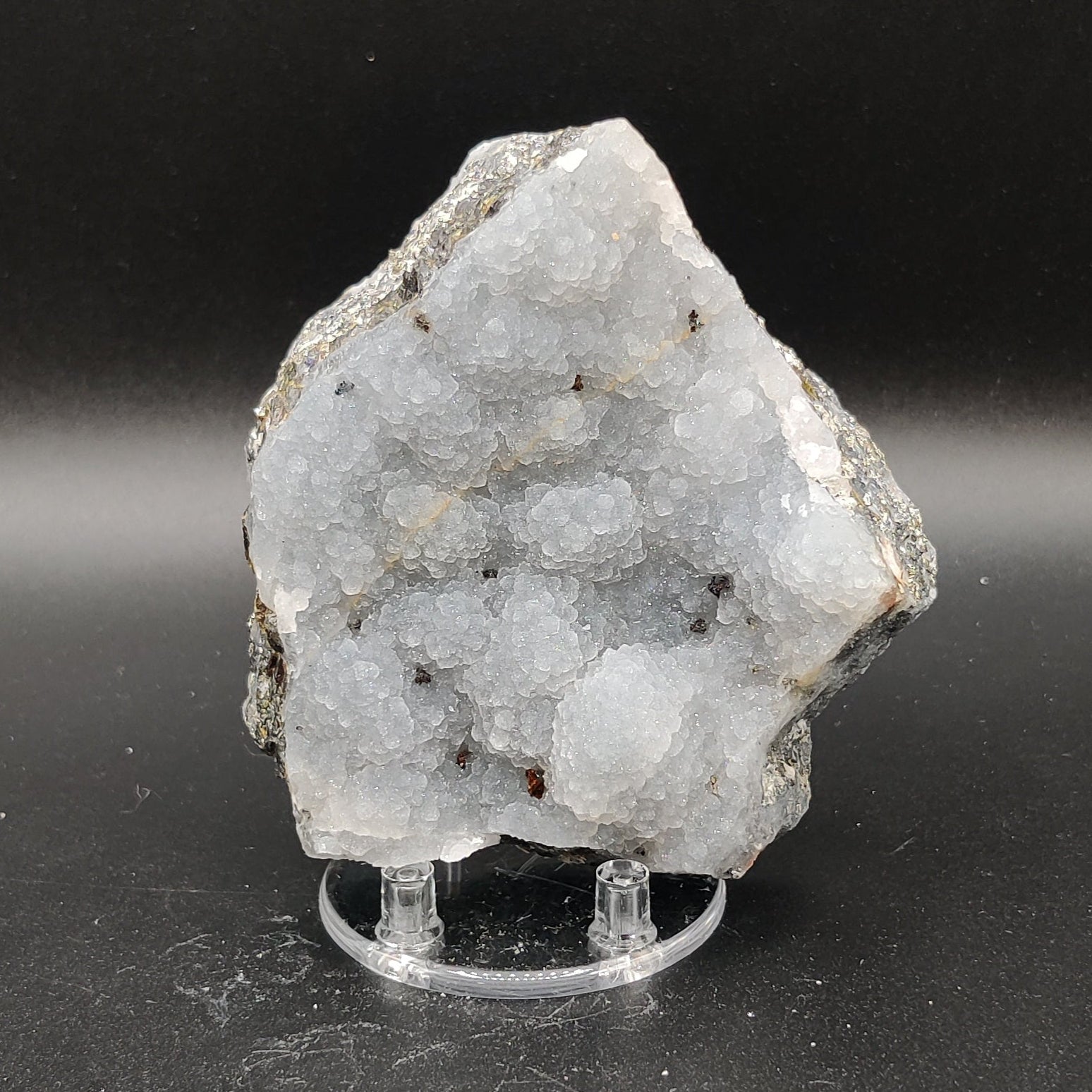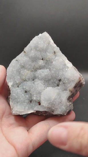 Pieza de colección formada por una matriz con calcopirita y esfalerita (también llamada blenda acaramelada) y un recubrimiento de calcedonia de color gris y muy brillante.