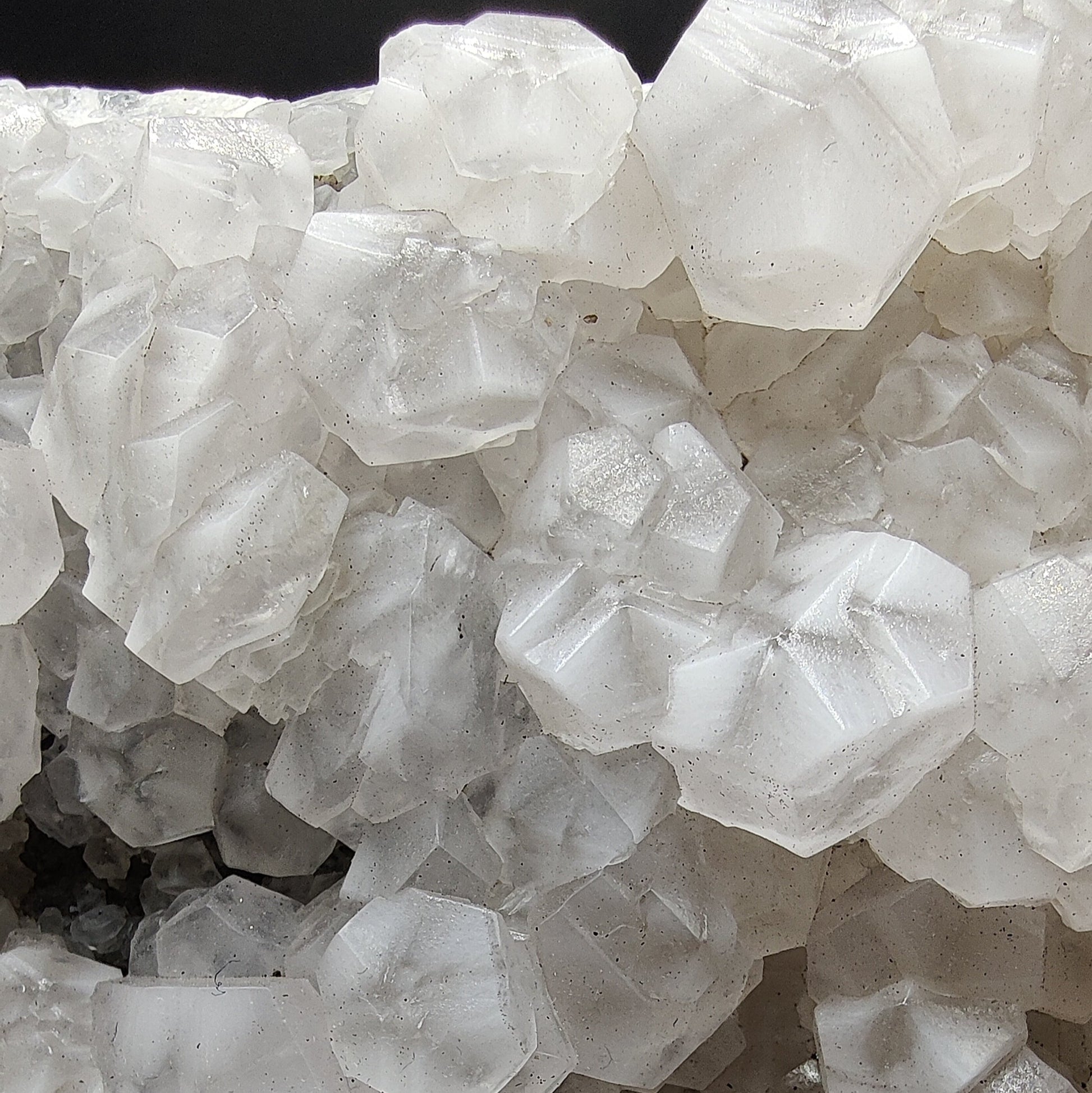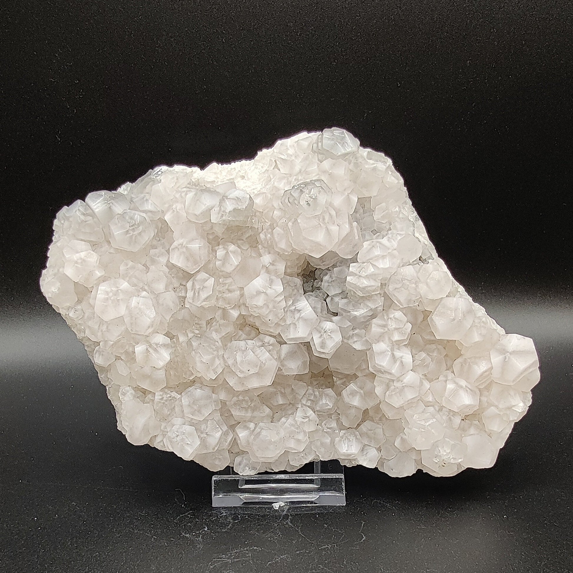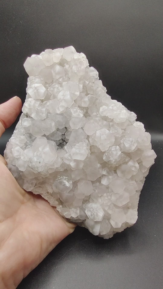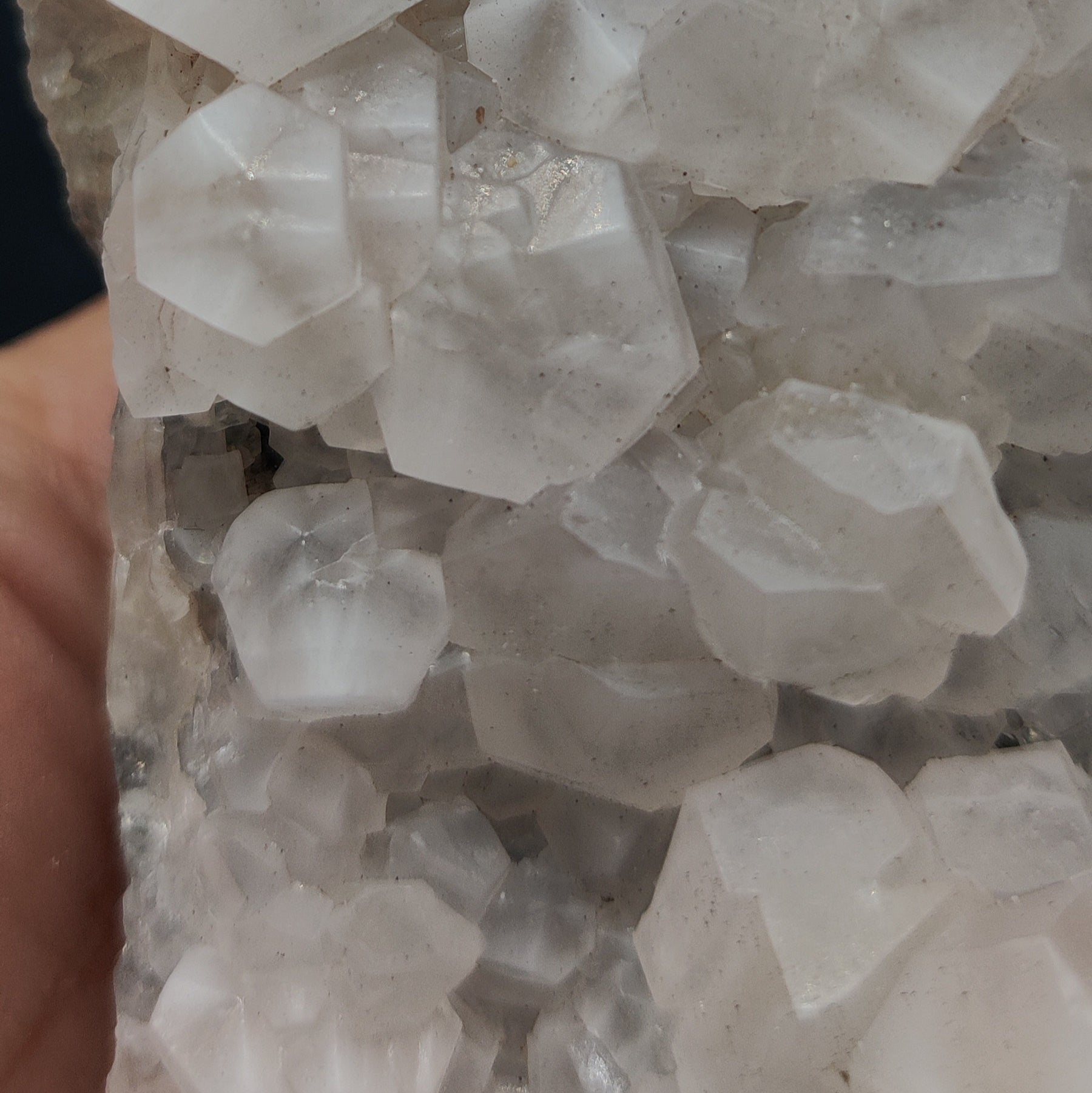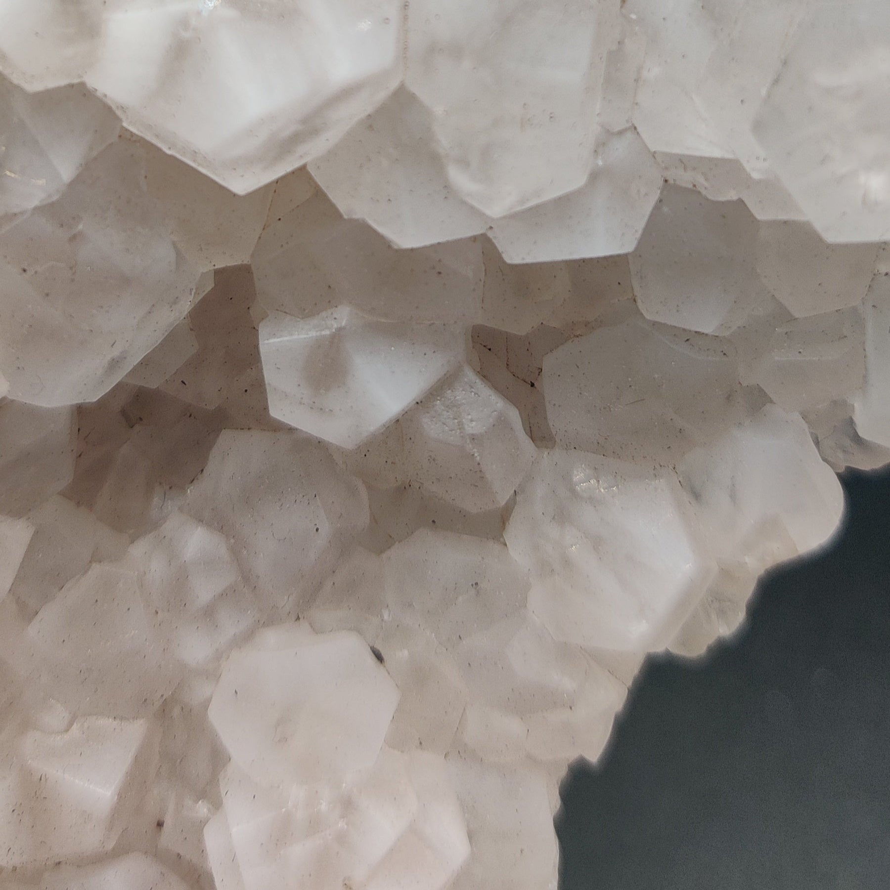Grupo de cristales bien formados de calcita, algunos maclados. Color blanco-rosado.