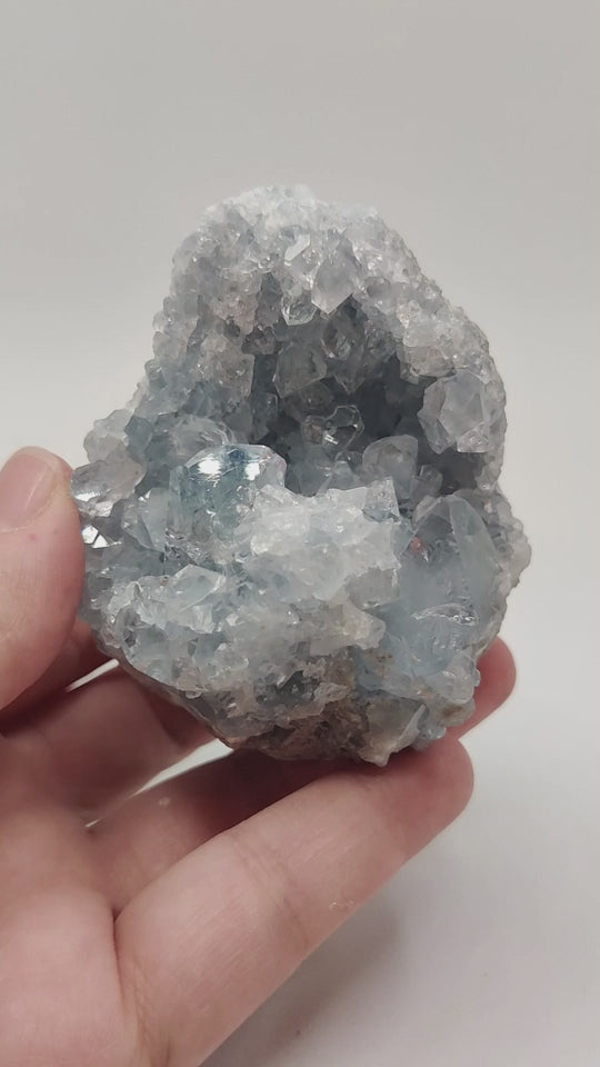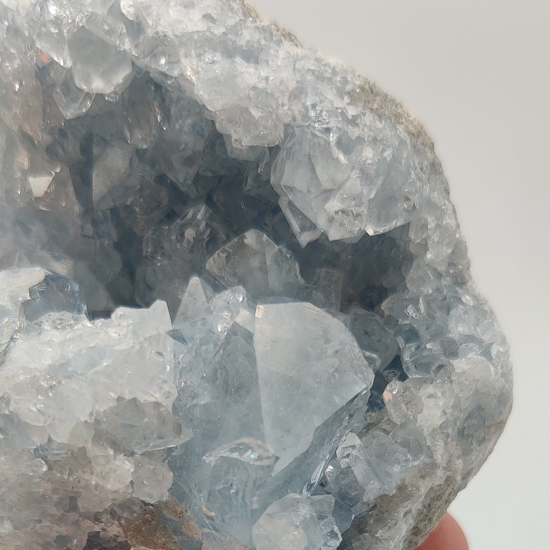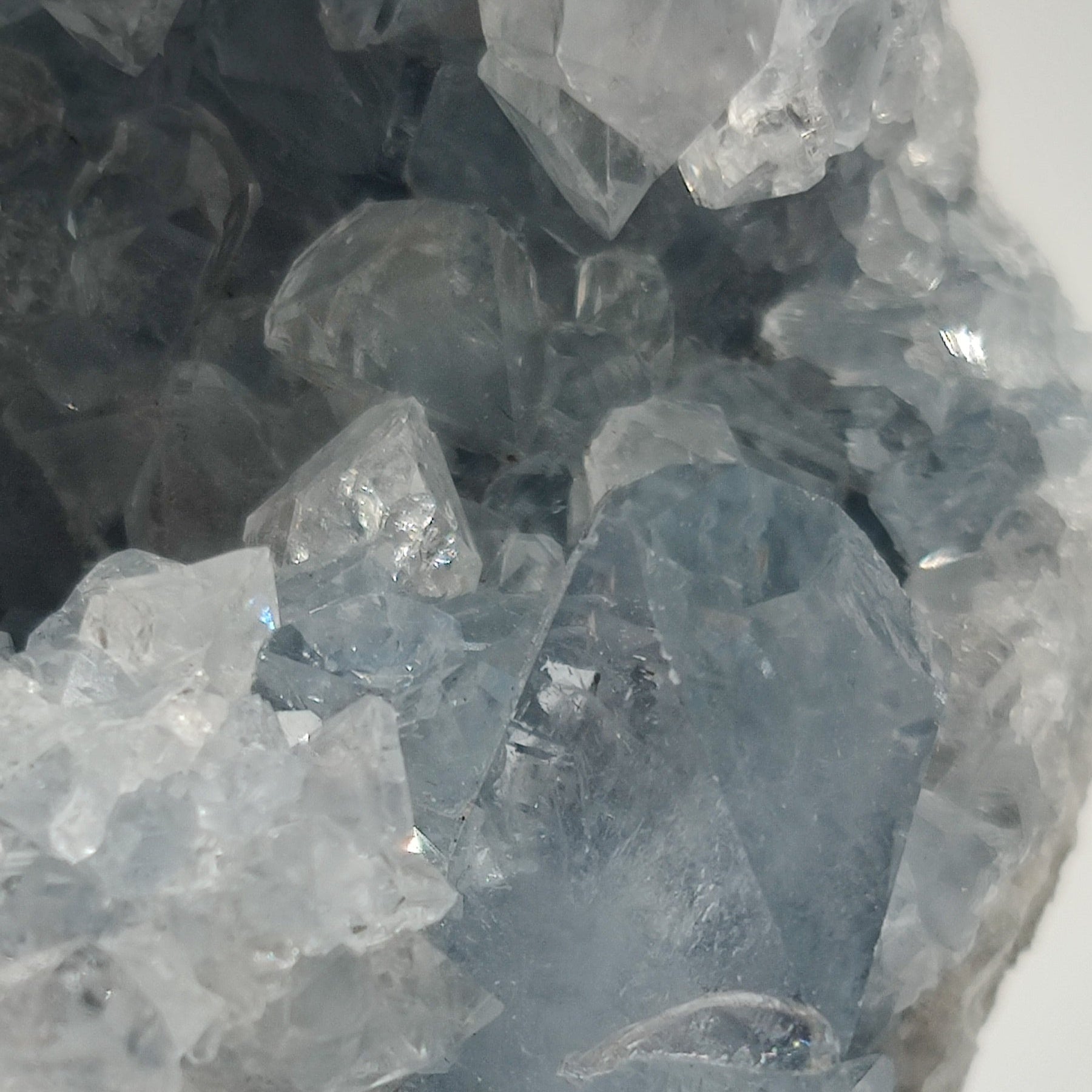 Drusa de celestina con dos cristales muy grandes de color intenso y buen brillo. Pieza muy estética.