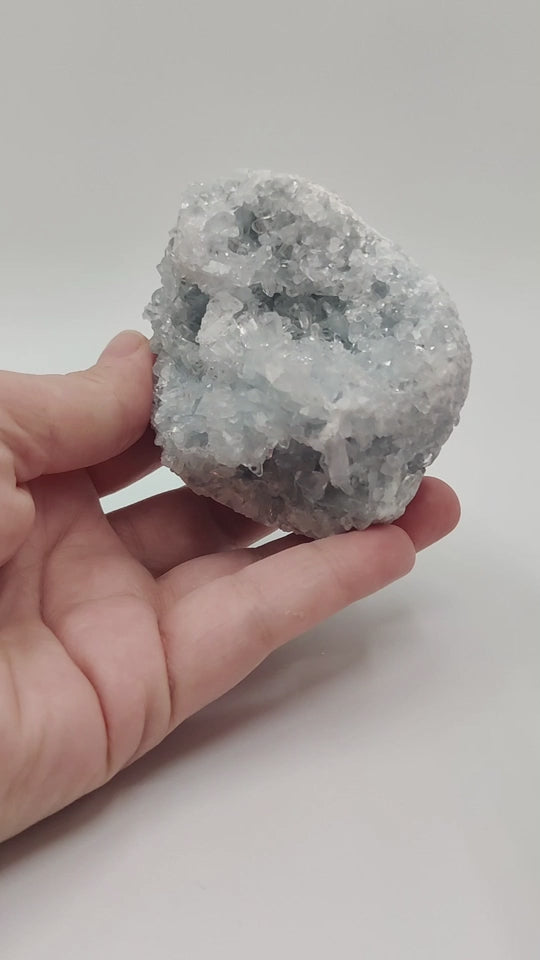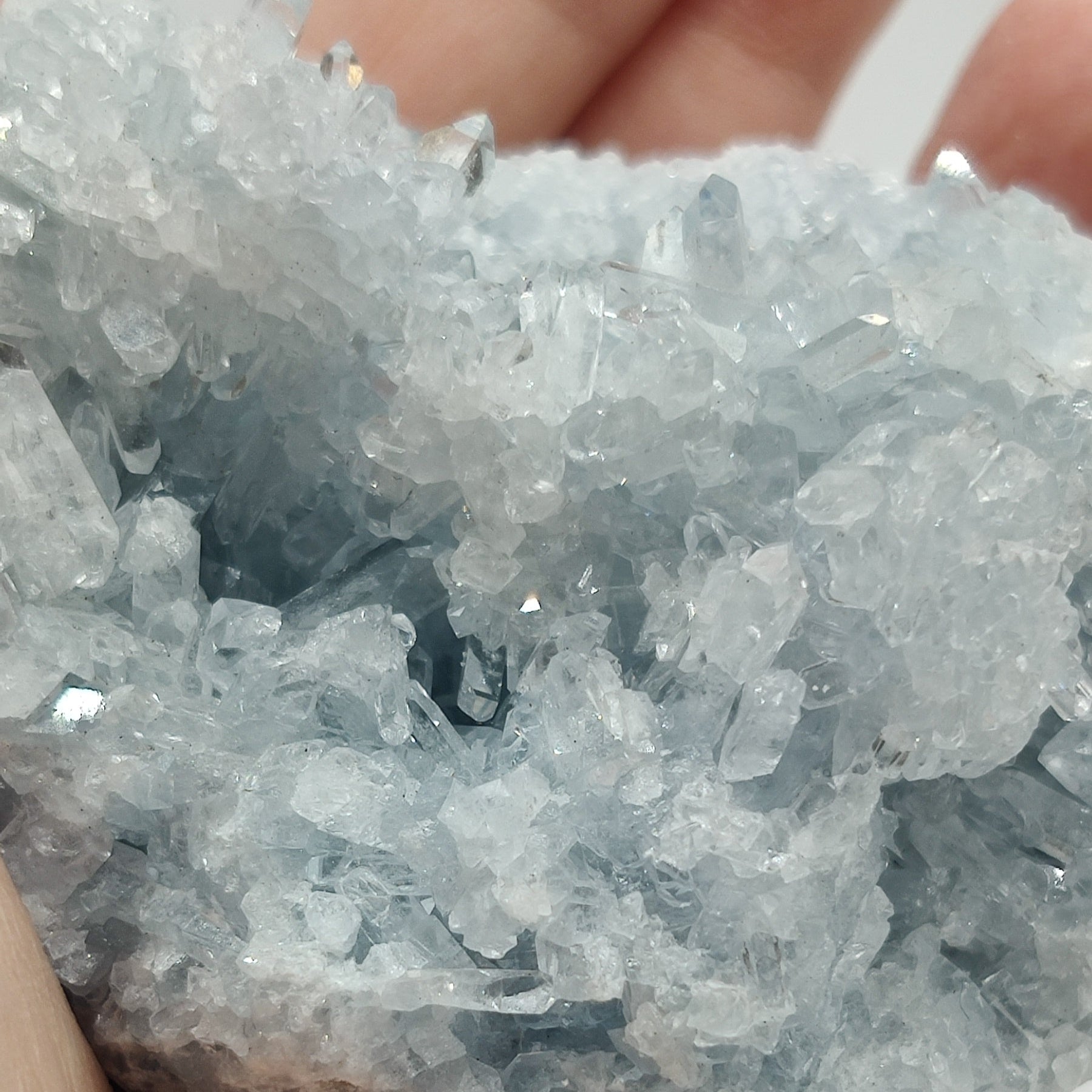 Bonita drusa de celestina con cavidades, cristales bien definidos de color azul clarito y brillo muy intenso.