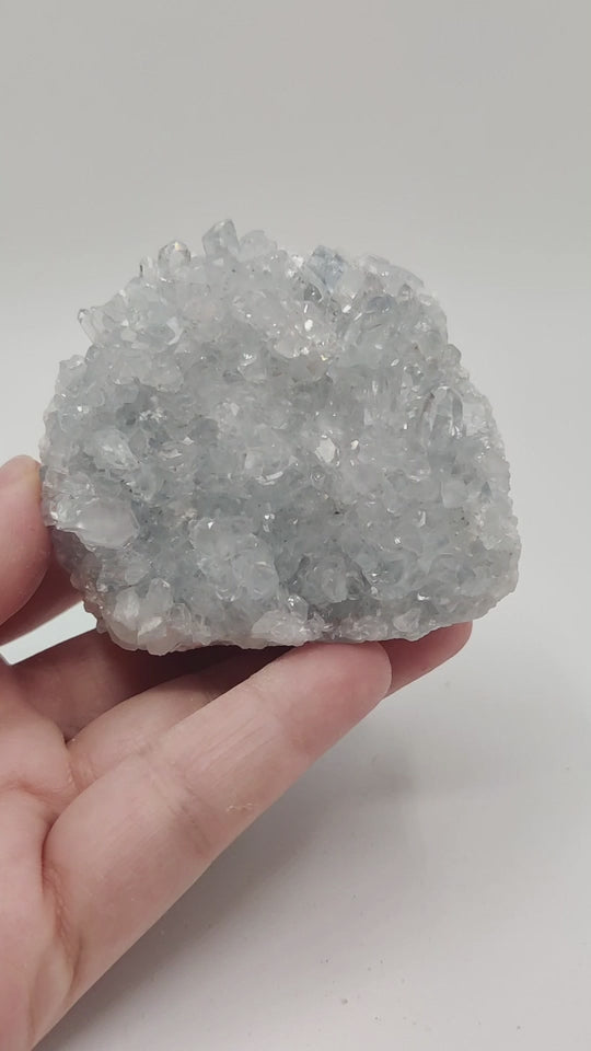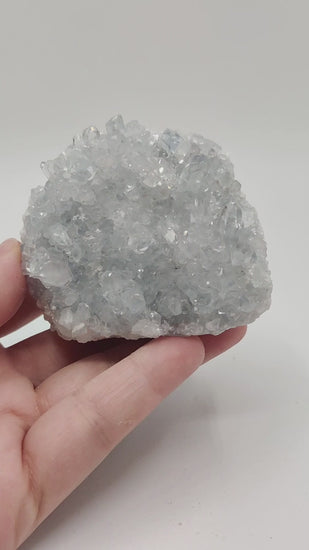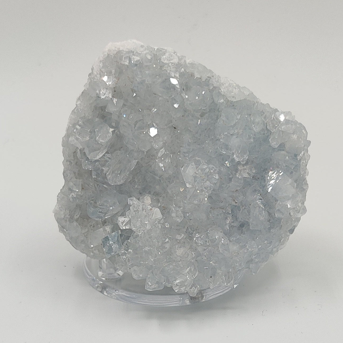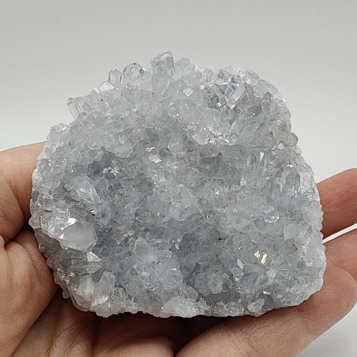 Drusa de celestina con mucho brillo y color azul suave.