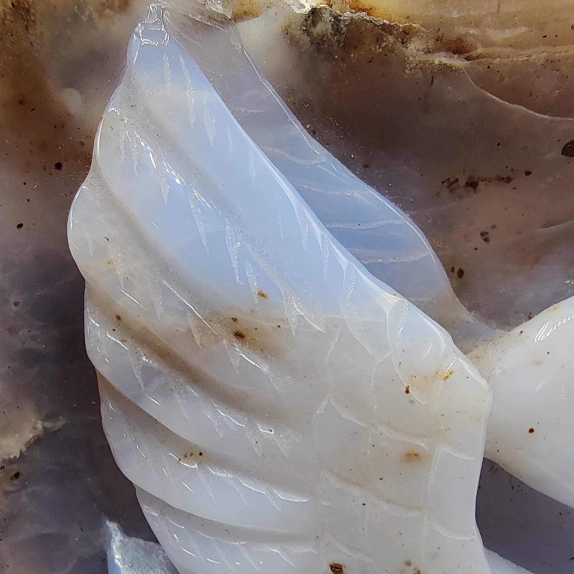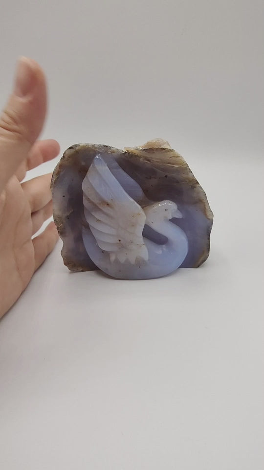 Figura tallada a mano en calcedonia azul con la propia parte externa del nódulo pulido.