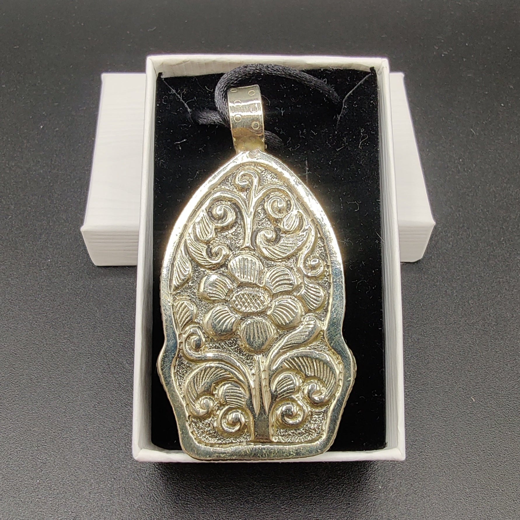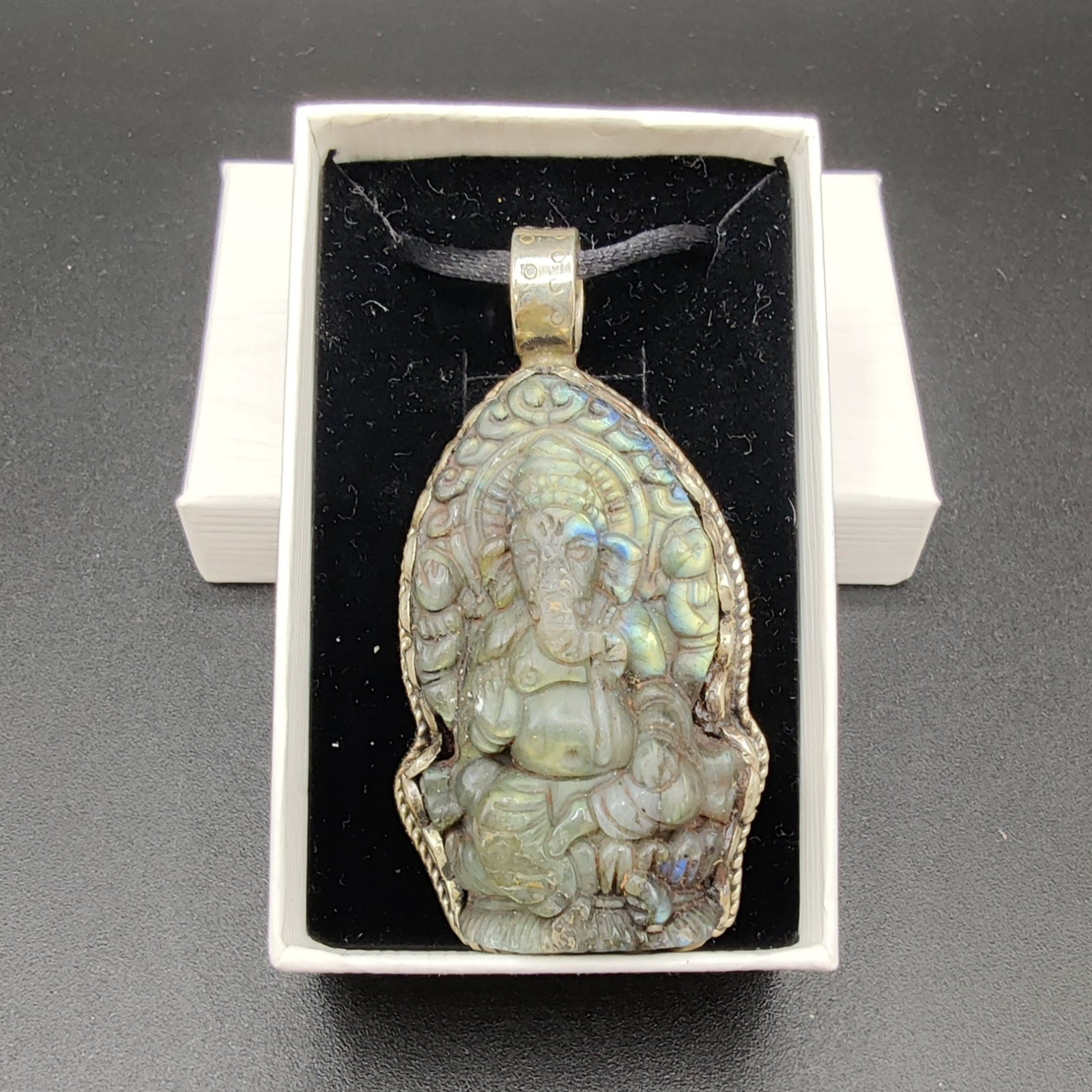 Colgante hecho a mano con alpaca y talla de Ganesha en labradorita.