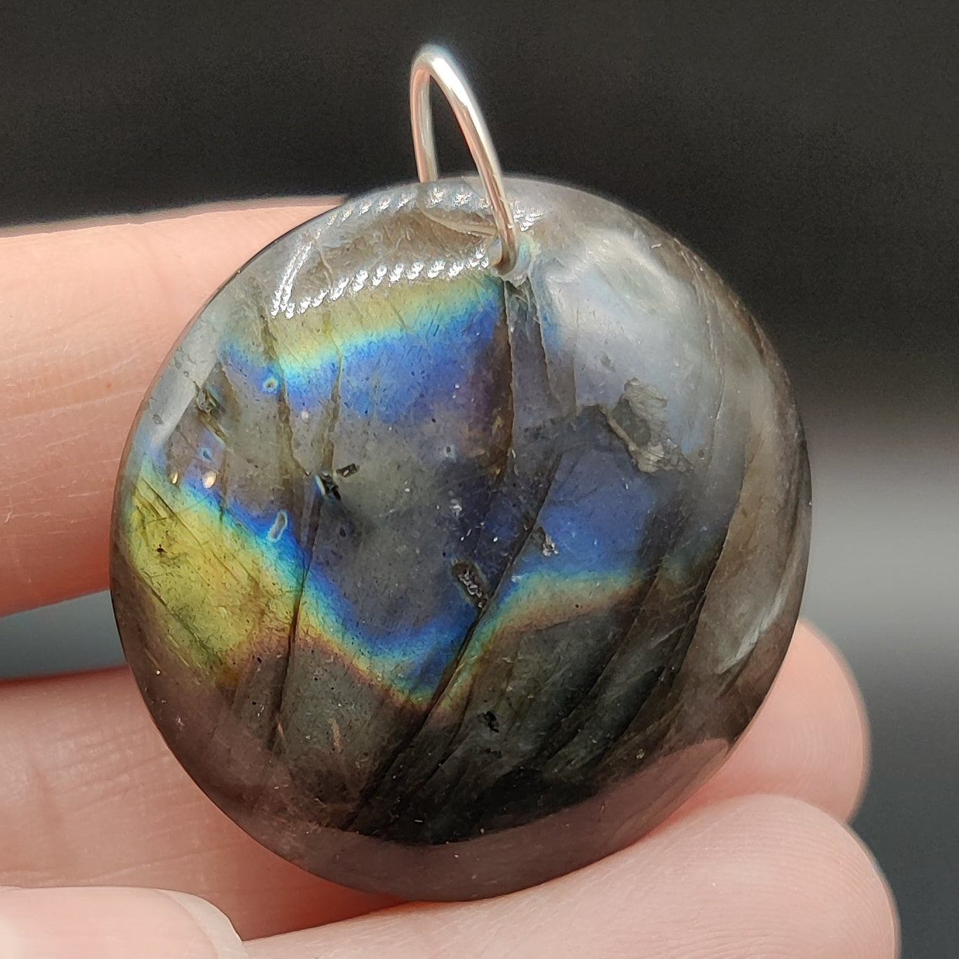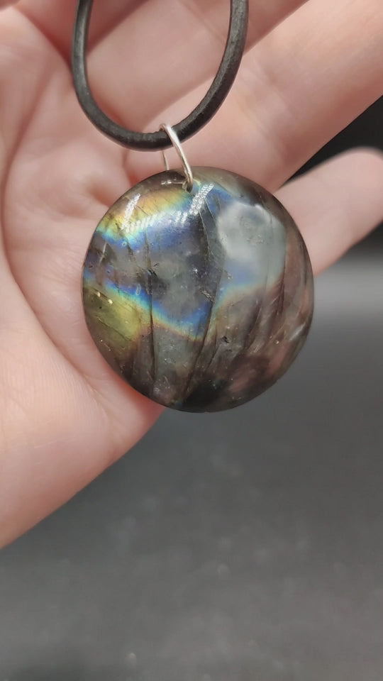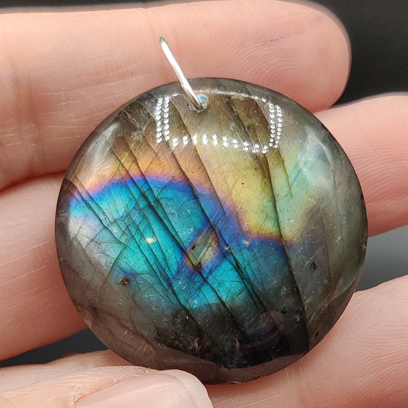 Colgante redondo de labradorita con colores que van desde el amarillo al verde, pasando por naranja y azul.