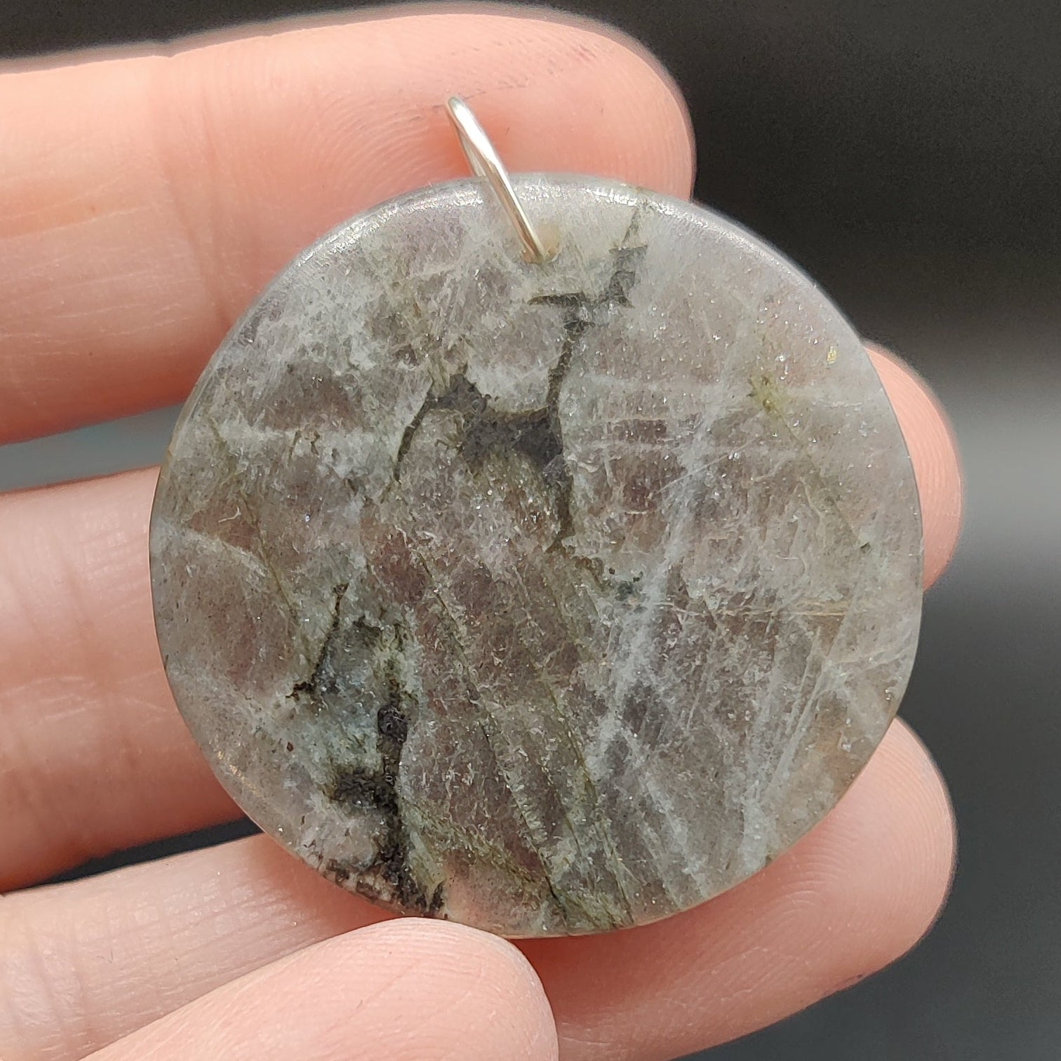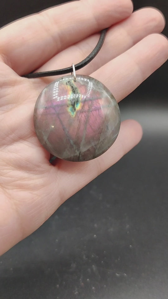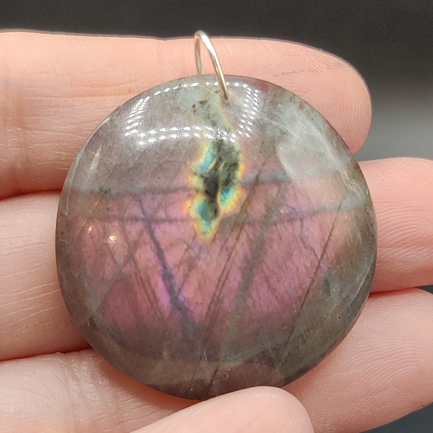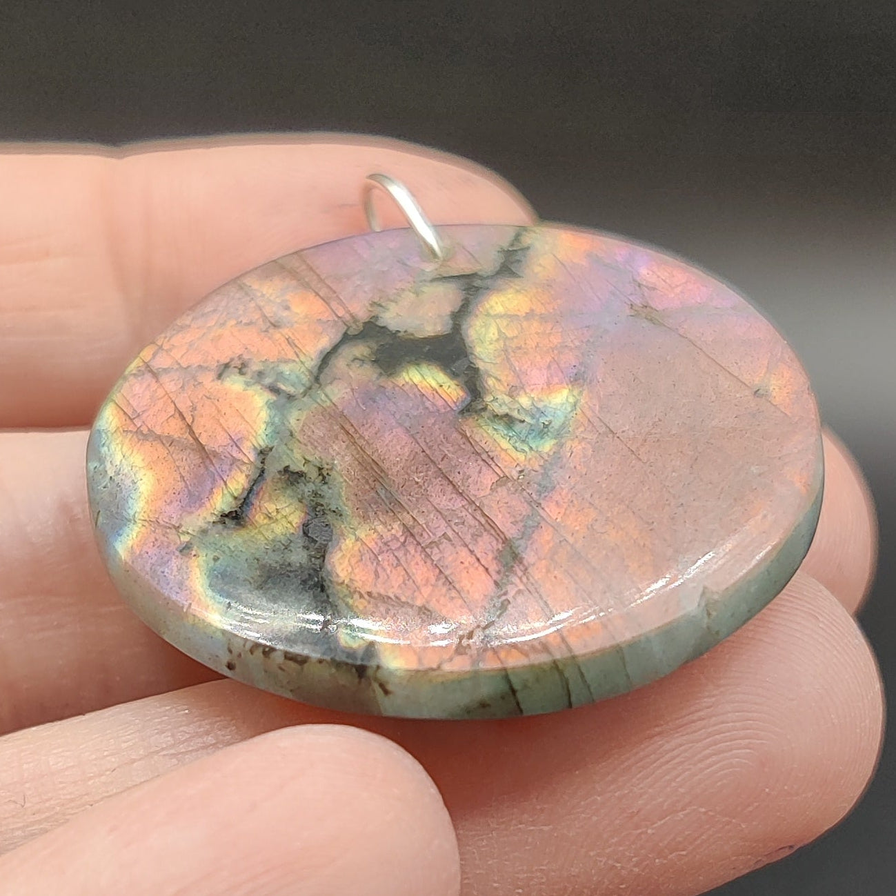 Colgante de cabujón redondo de labradorita. Color rosa, naranja y violeta, con algunas líneas amarillas.