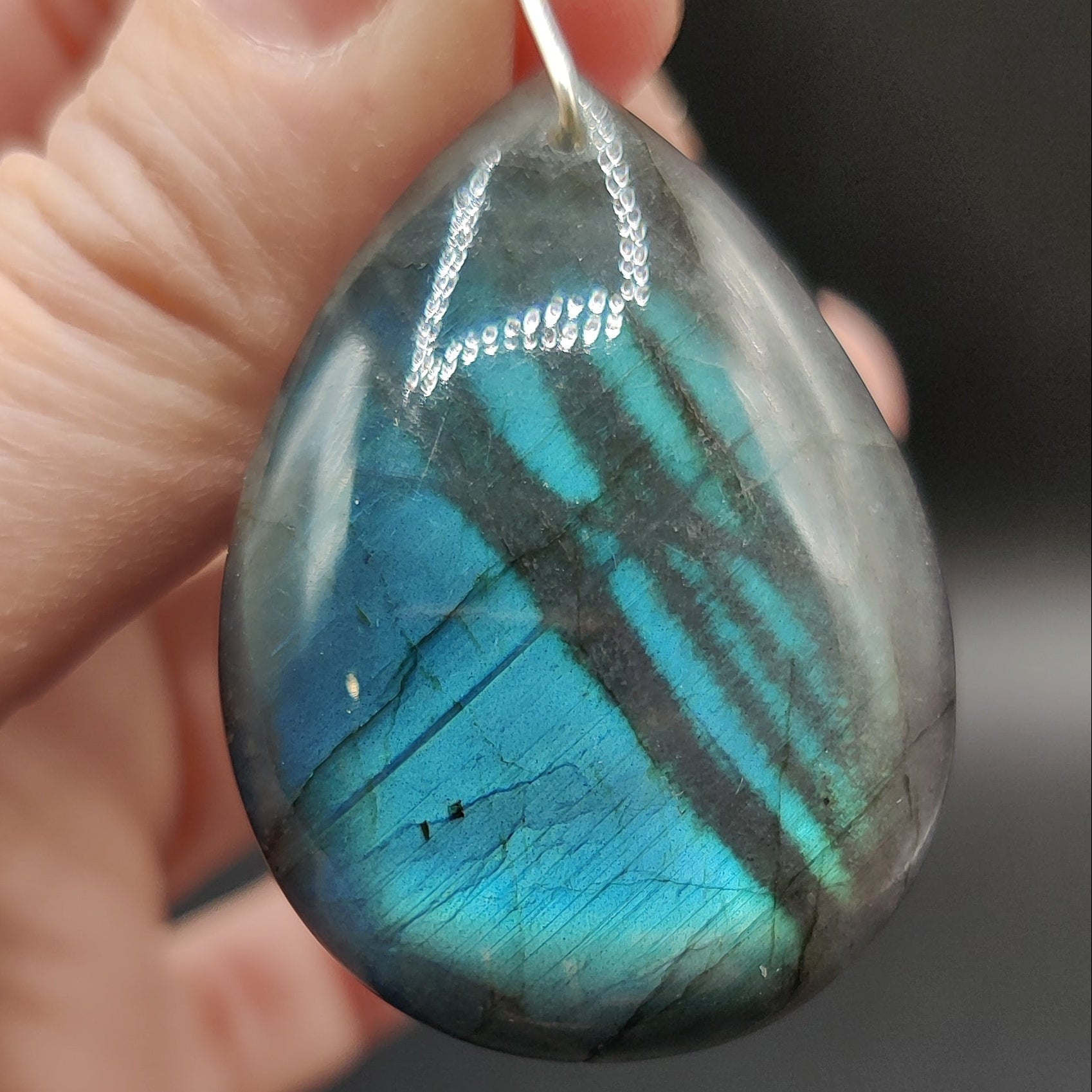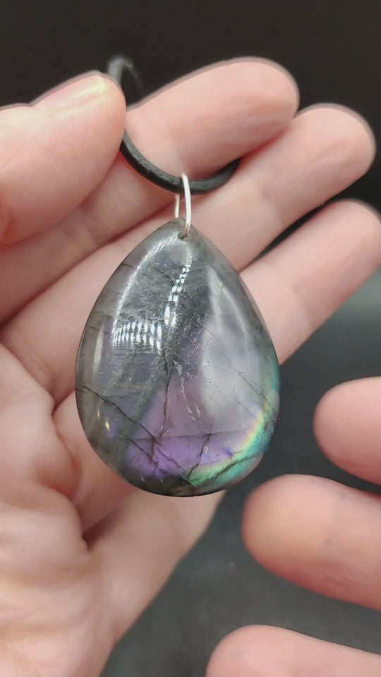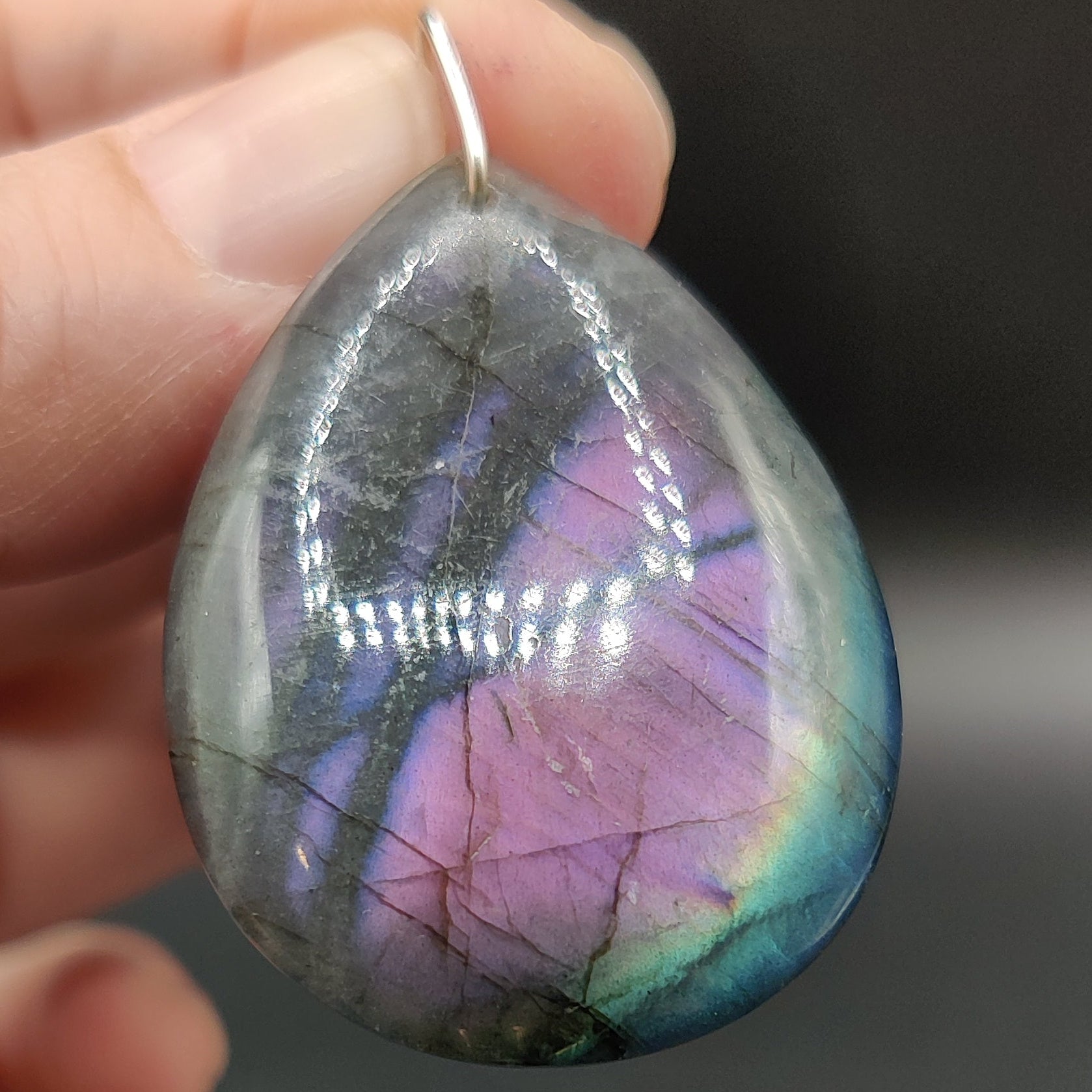 Colgante de labradorita en forma de gota, por un lado de color rosa púrpura y por el otro azul, verdoso y amarillo.
