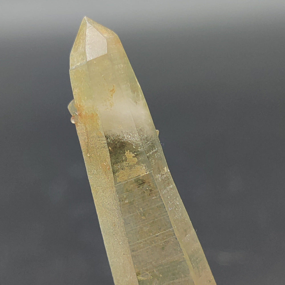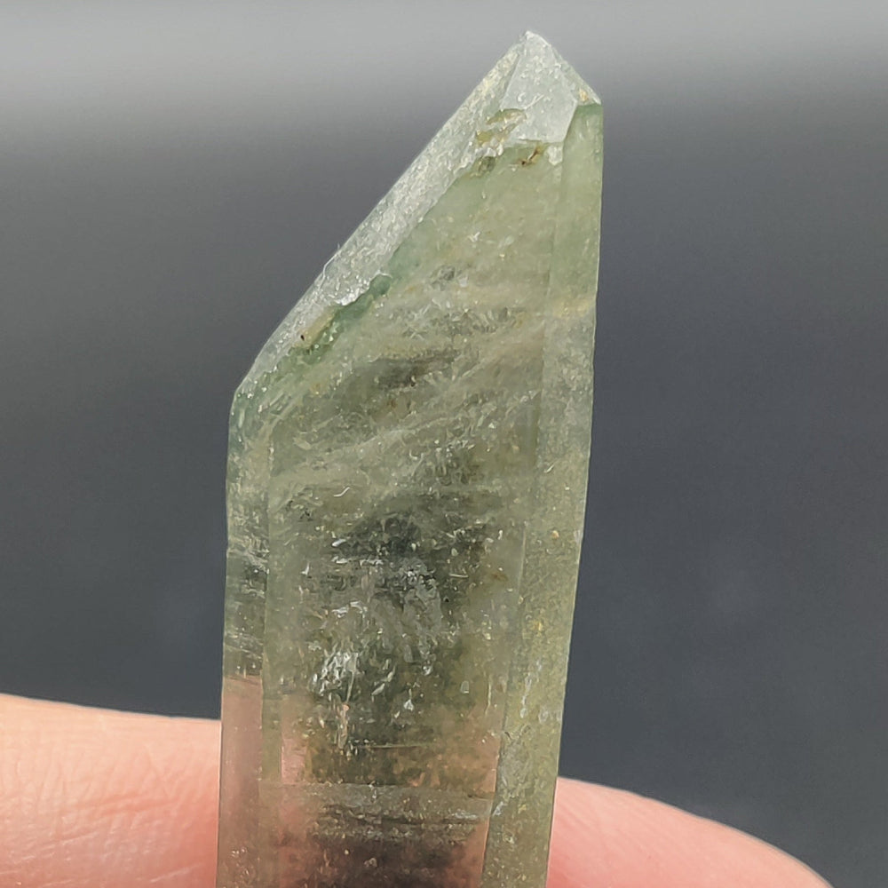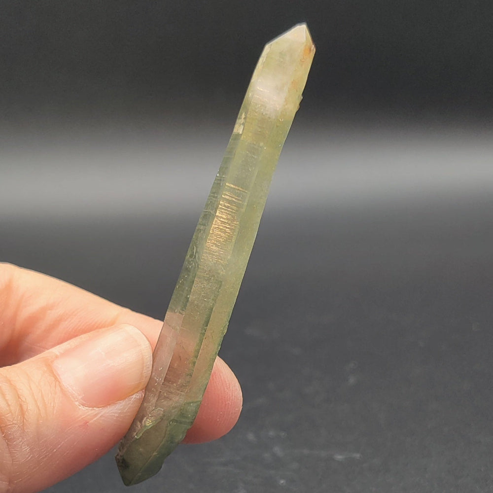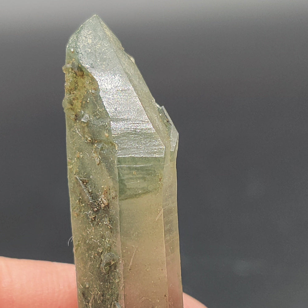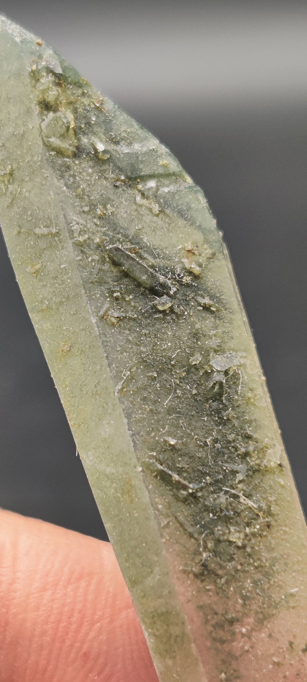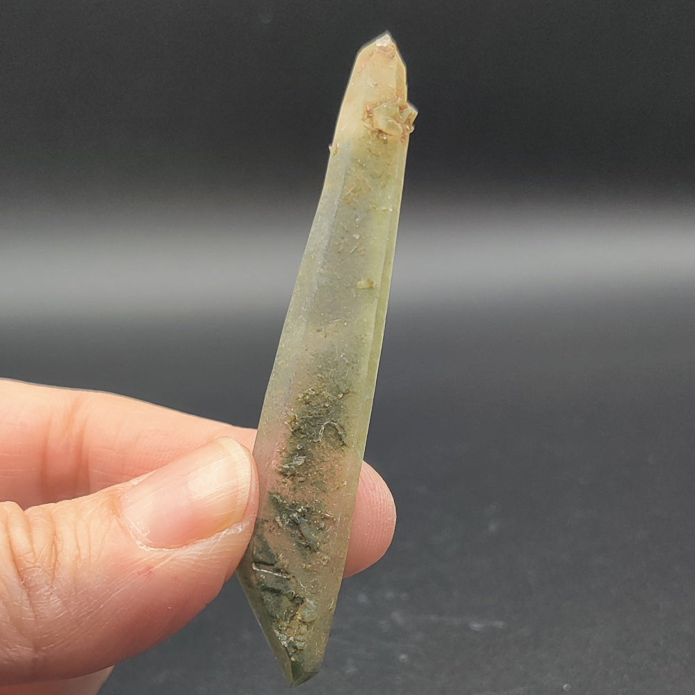 Esta pieza es un cristal de cuarzo natural biterminado, láser con inclusiones de clorita.
