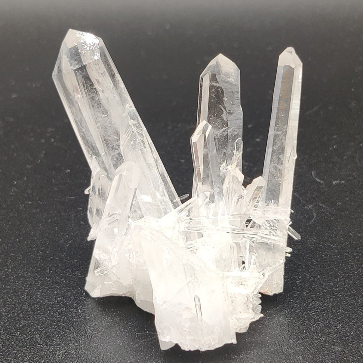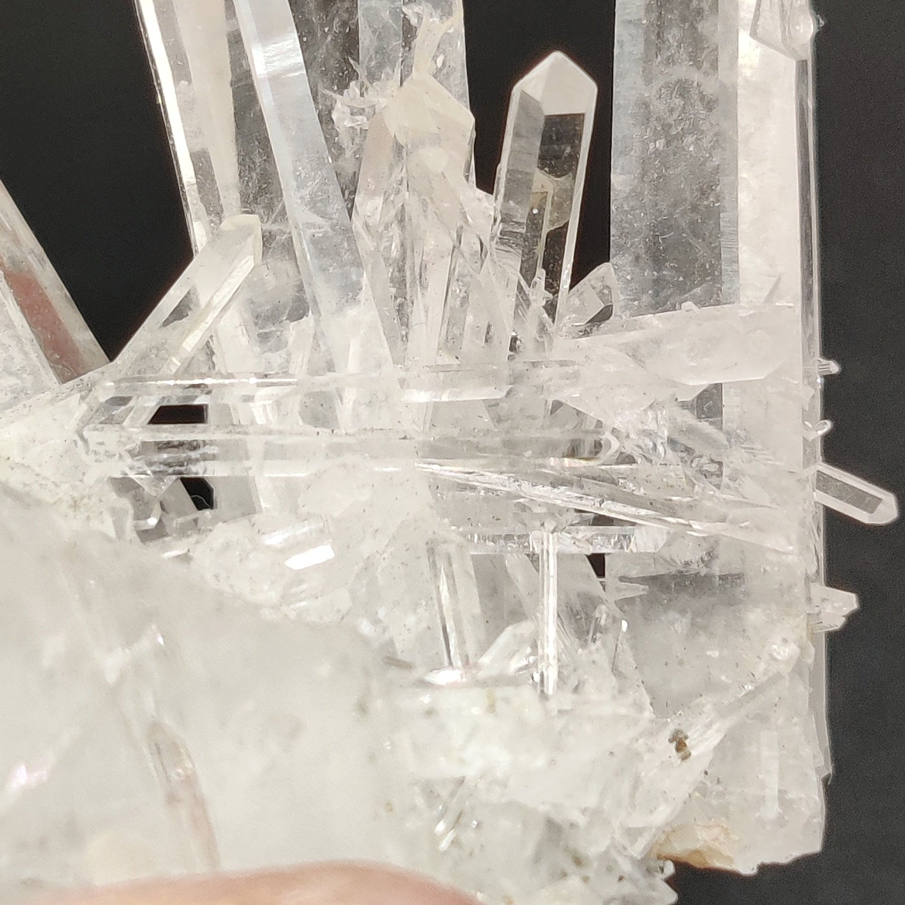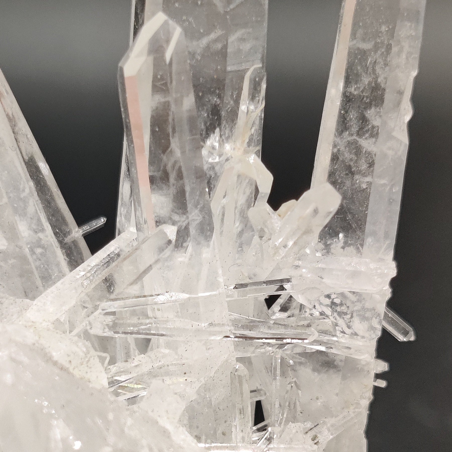 Drusa muy estética de cristal de roca con puntas de tamaños muy variados, desde piezas como agujas a un cristal principal más ancho. Muy transparente y brillante.