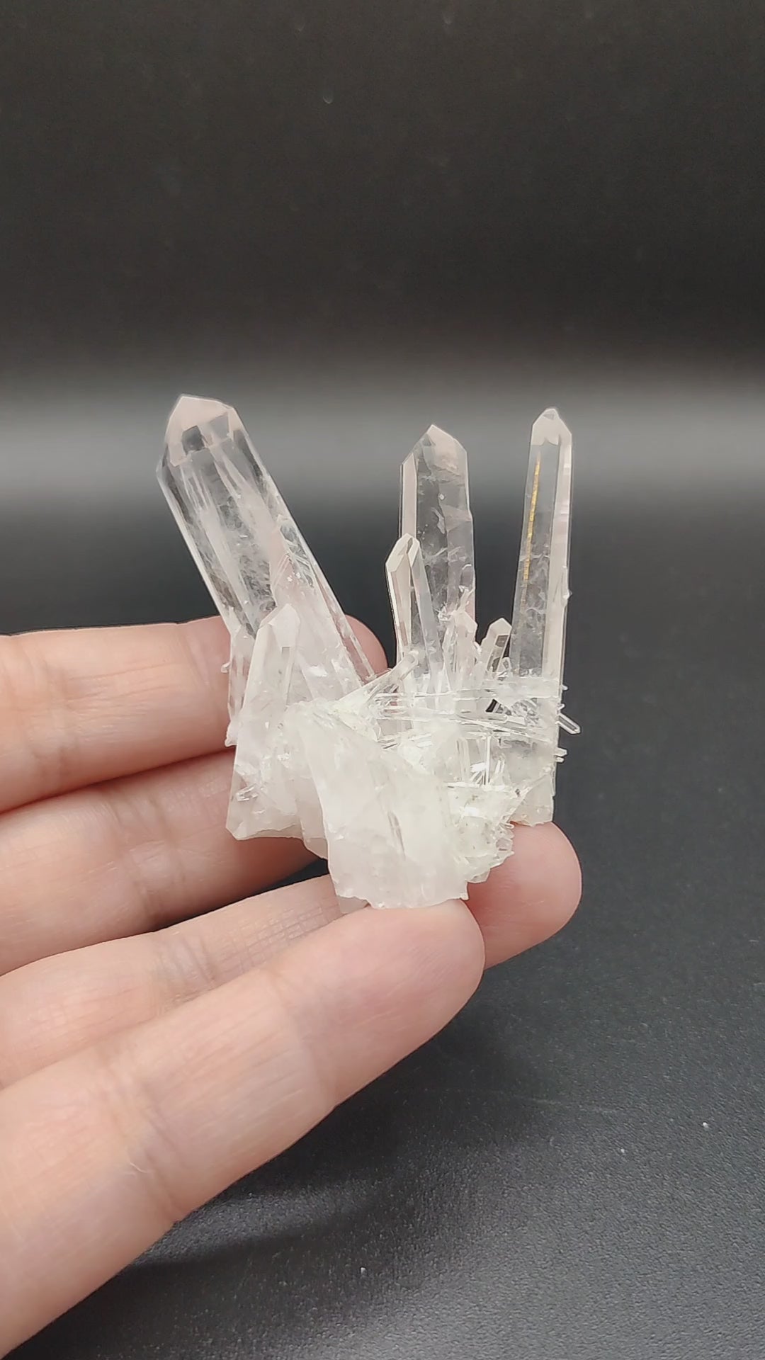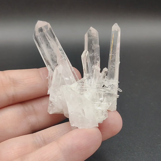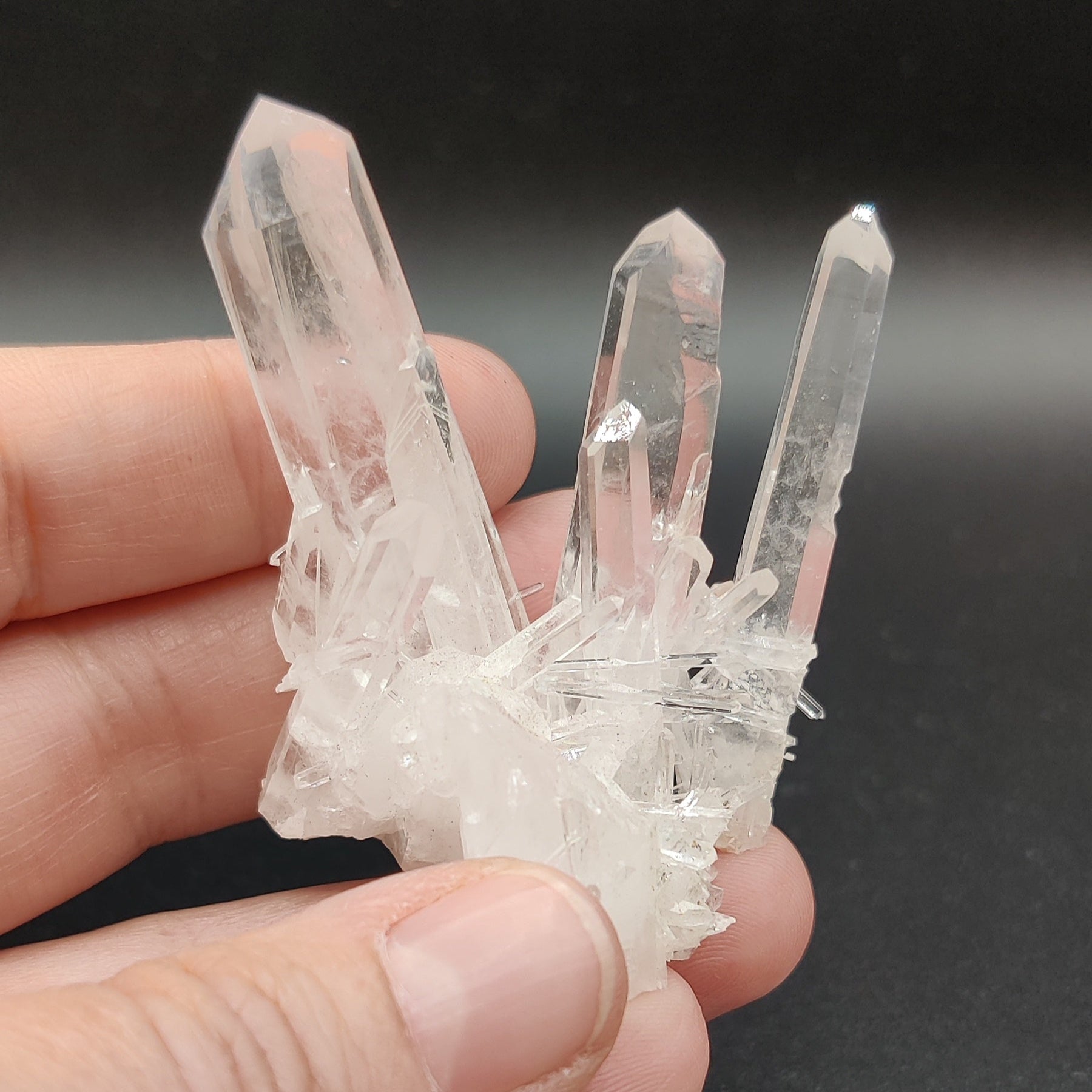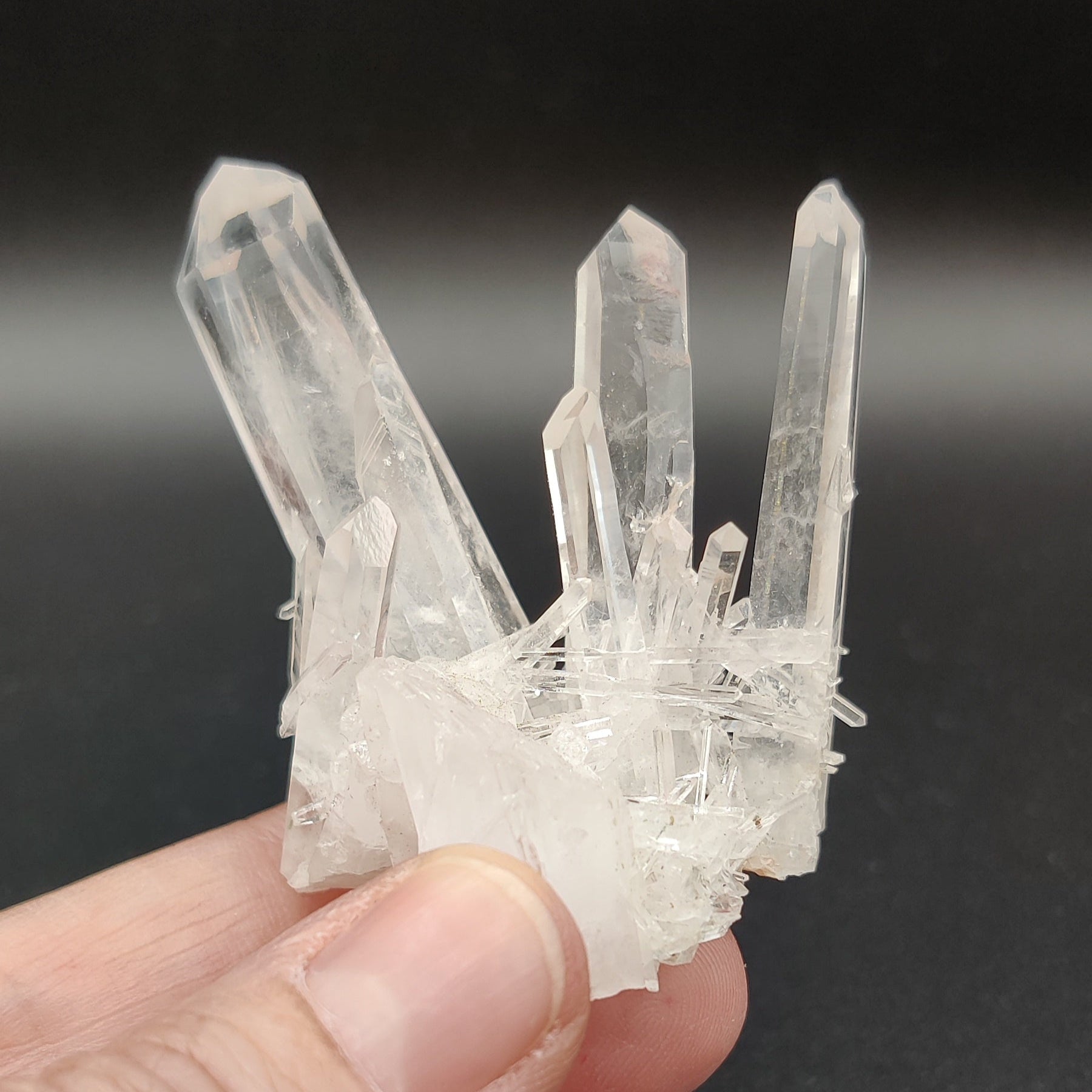 Drusa muy estética de cristal de roca con puntas de tamaños muy variados, desde piezas como agujas a un cristal principal más ancho. Muy transparente y brillante.