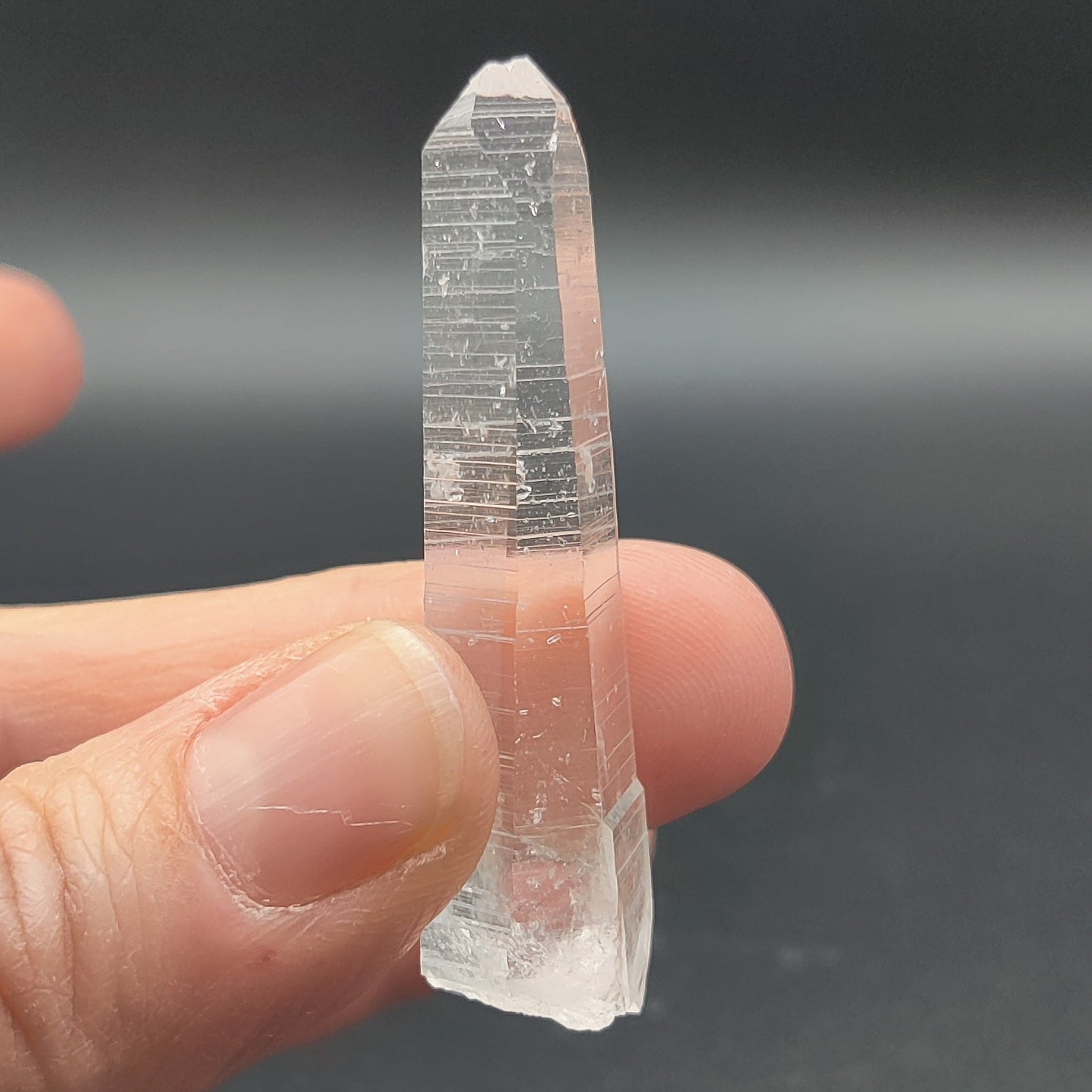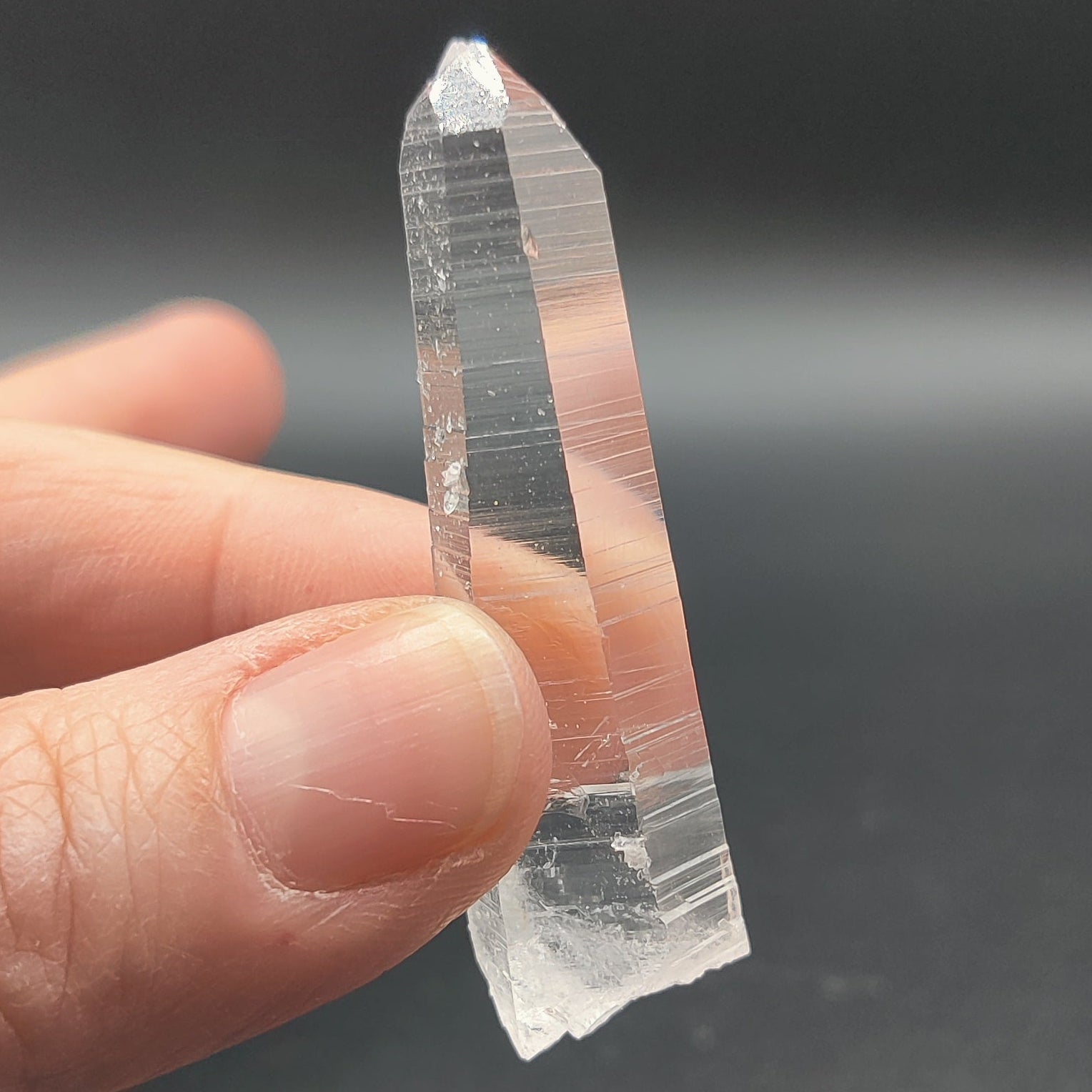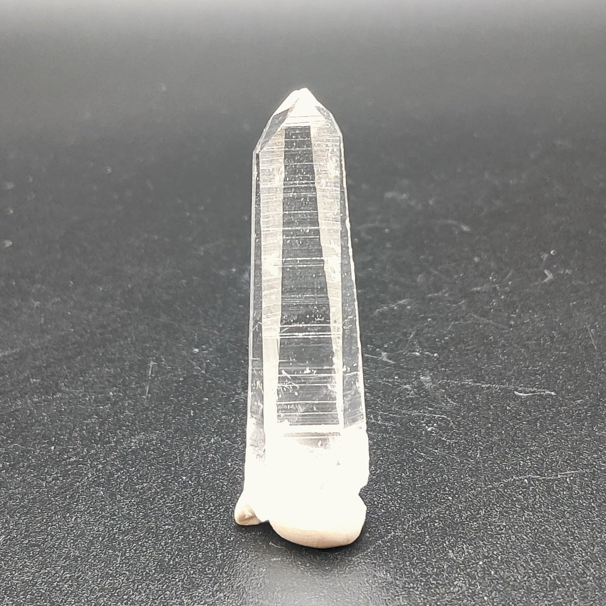 Punta de cuarzo lemuriano láser muy transparente y brillante, bien definida. En una de las caras se ha formado varios mini cristales de cuarzo.