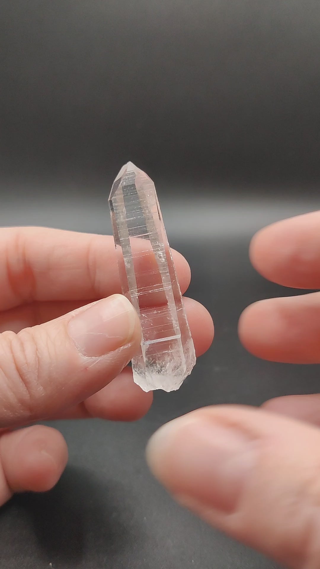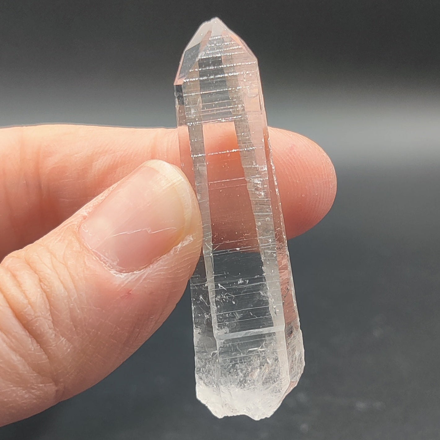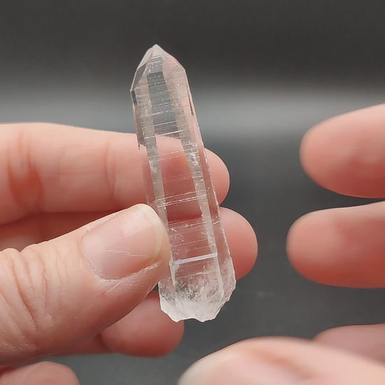 Punta de cuarzo lemuriano láser muy transparente y brillante, bien definida. En una de las caras se ha formado varios mini cristales de cuarzo.