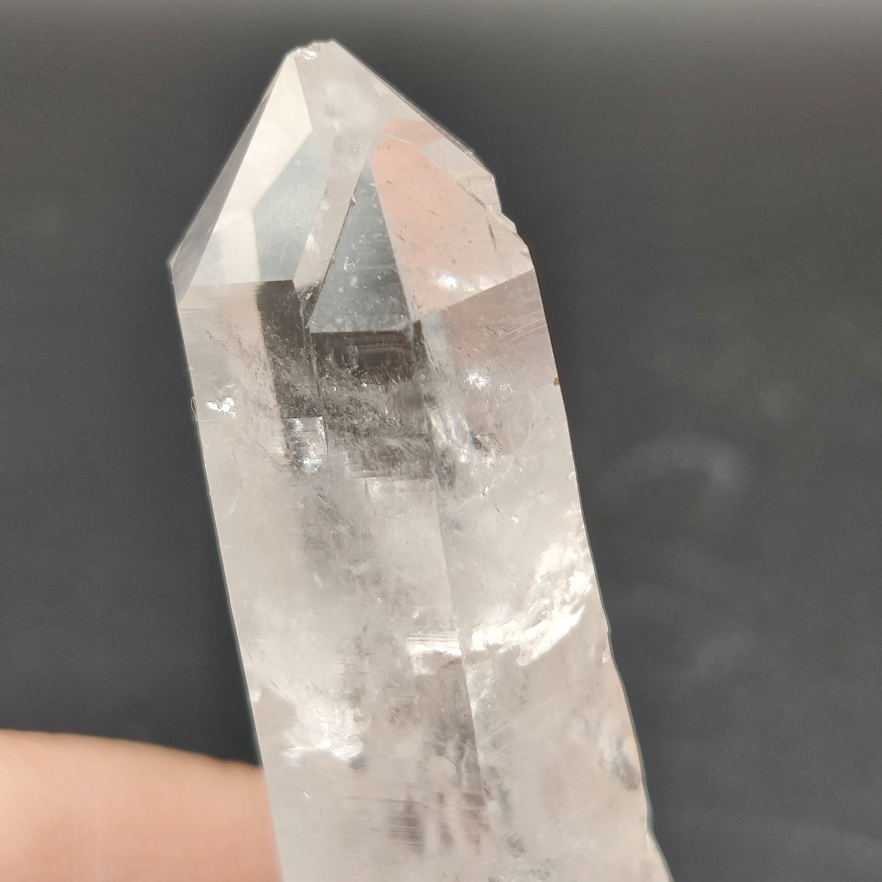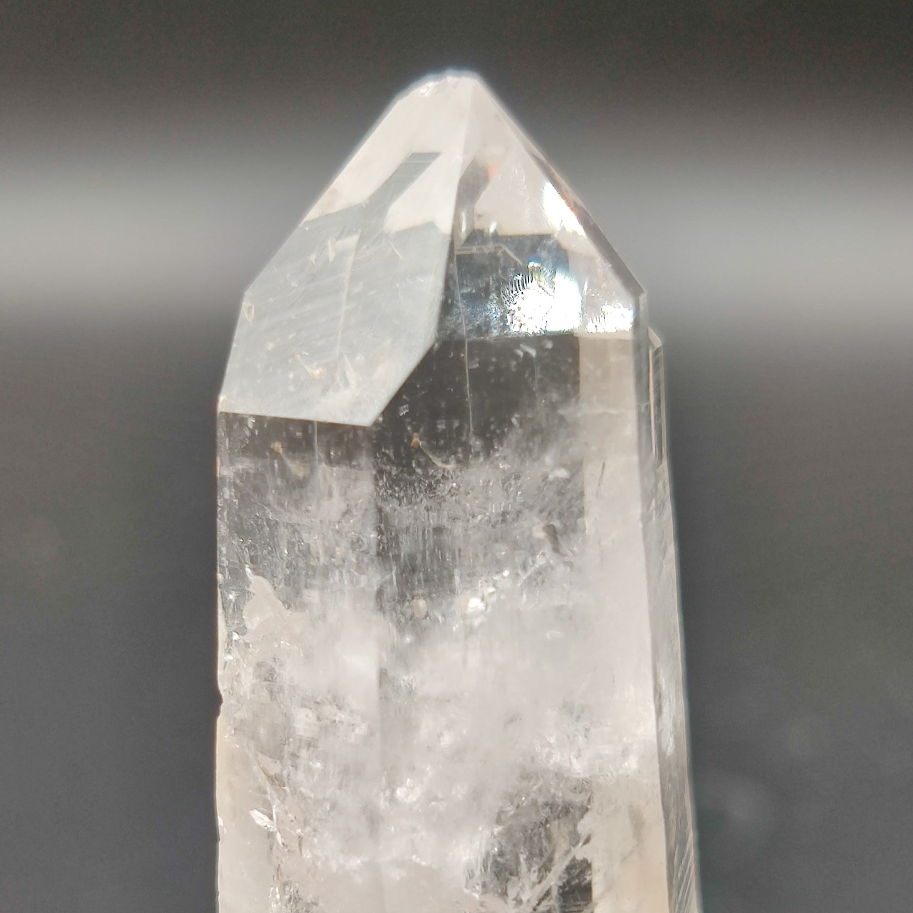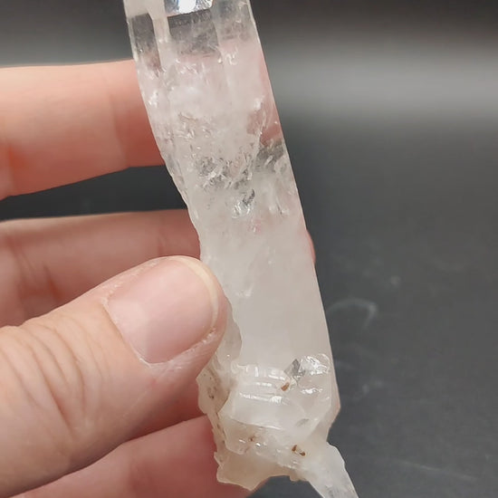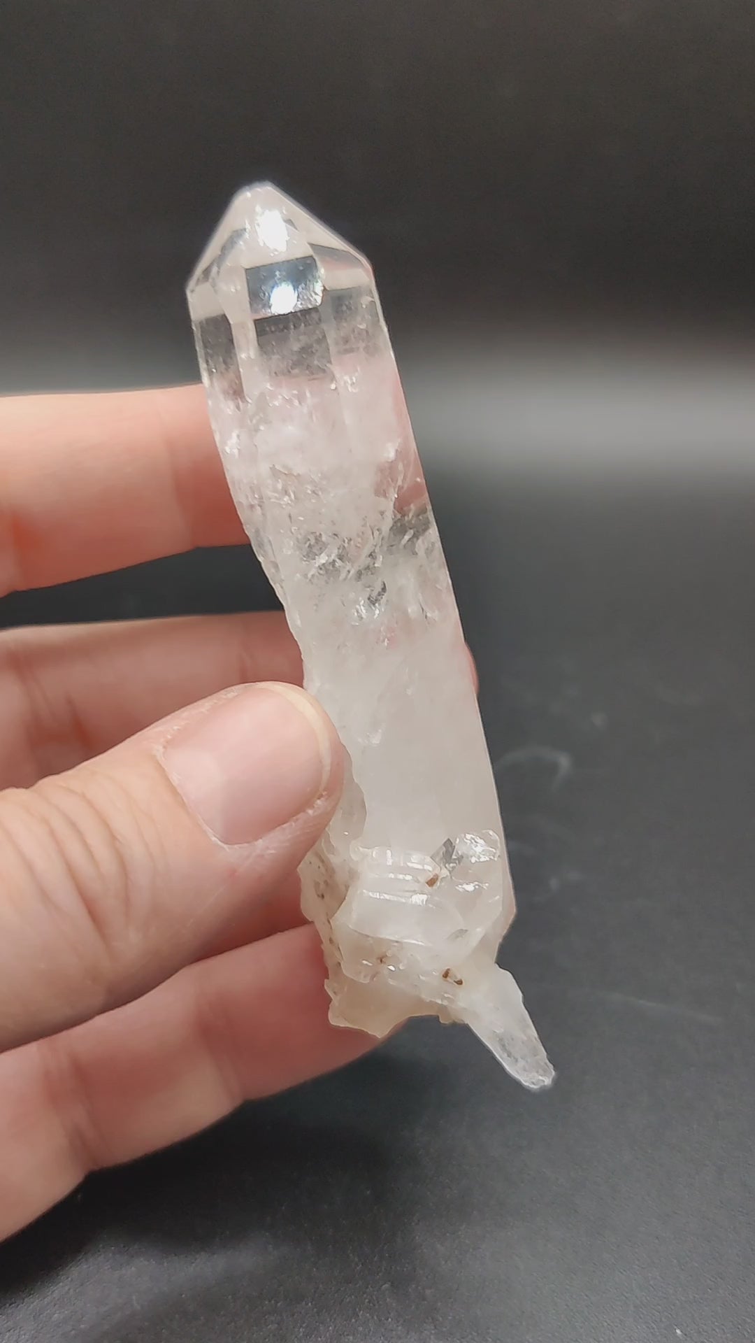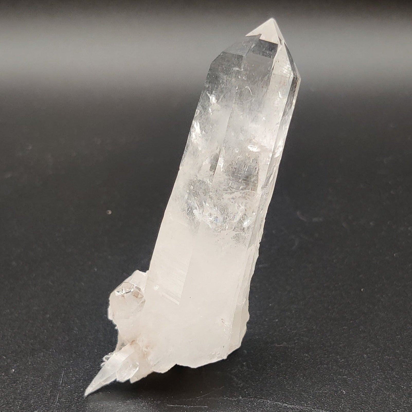 Punta de cuarzo fusionado. En el romboedro se observa esta fusión de los dos cristales. Pequeño grupo de otros cristales en la base.