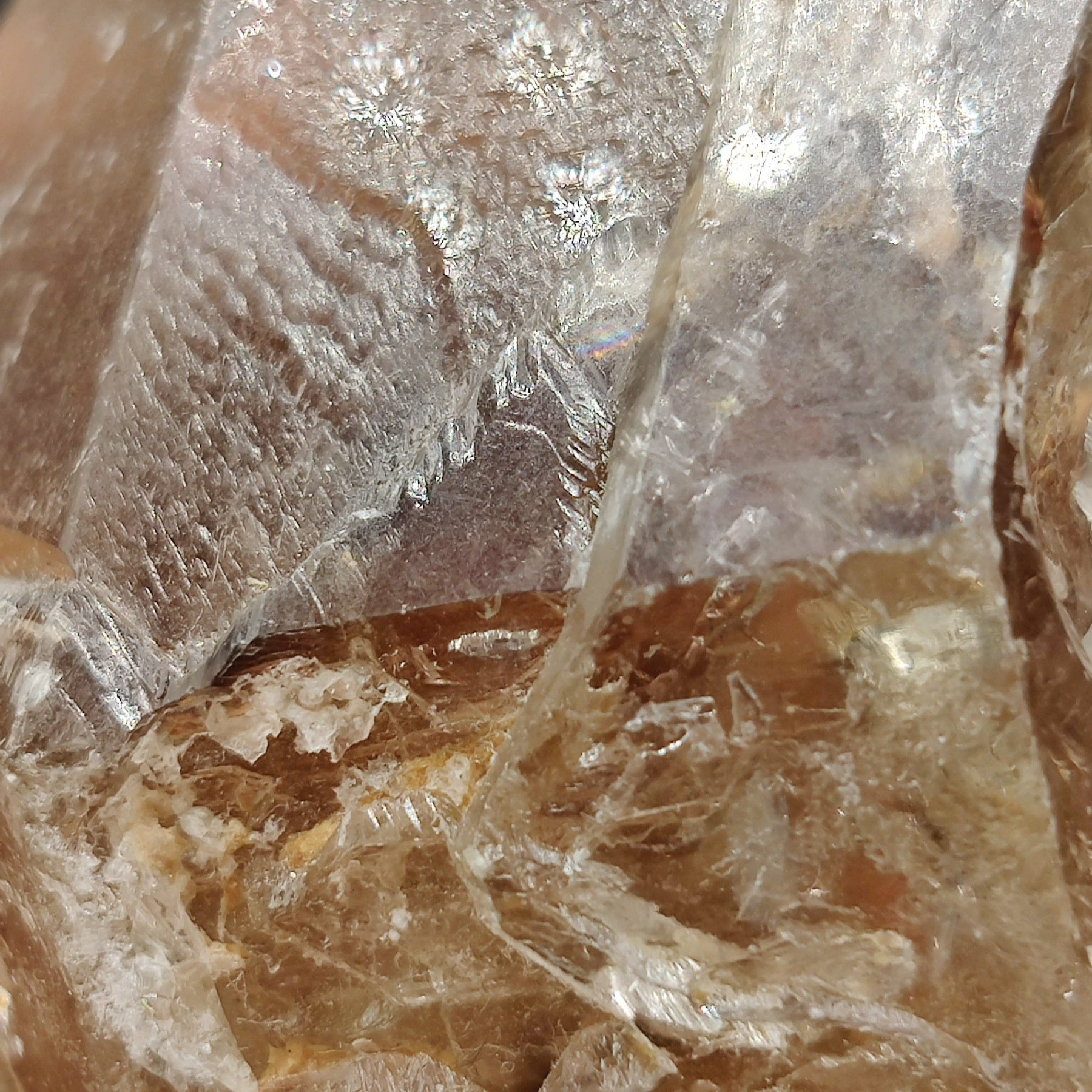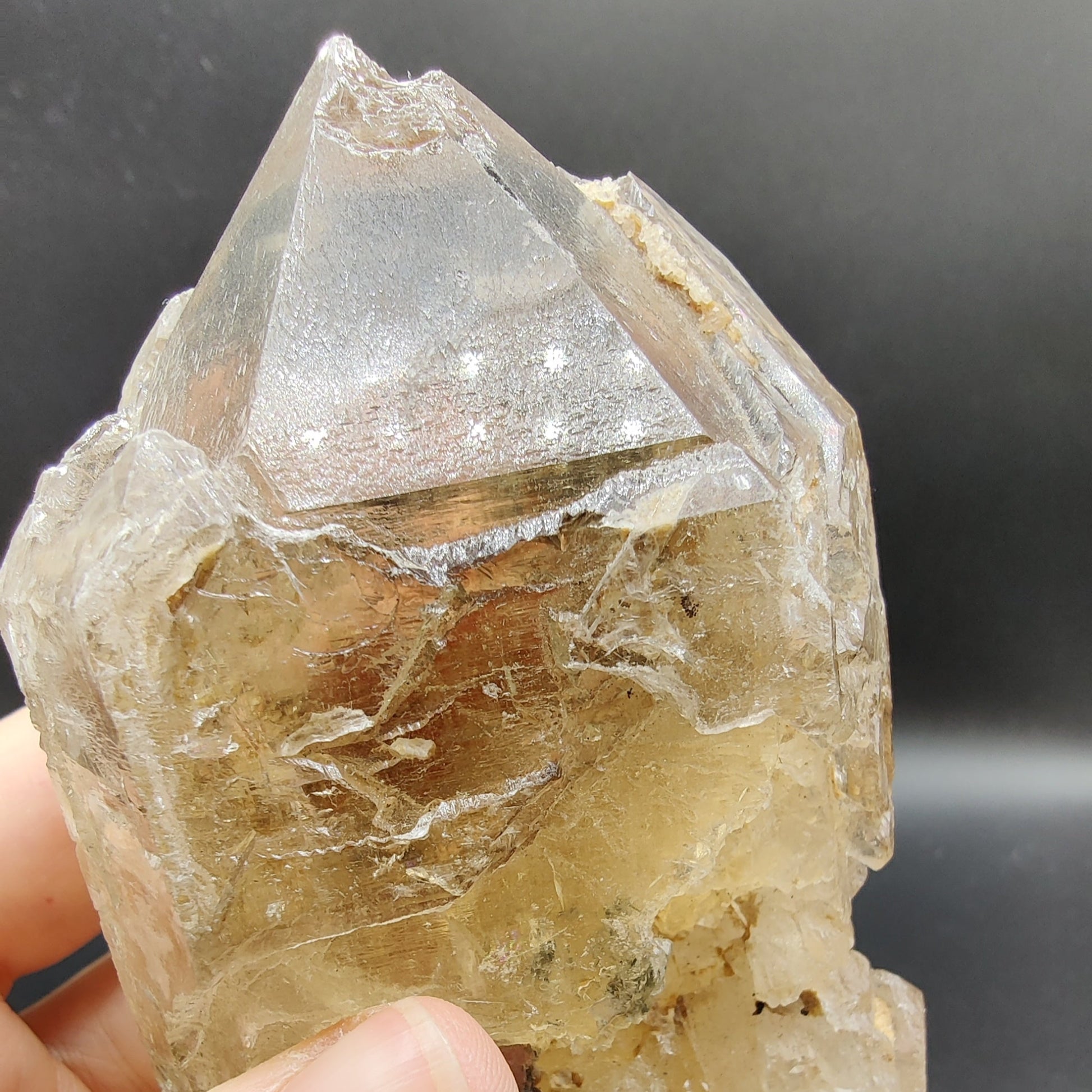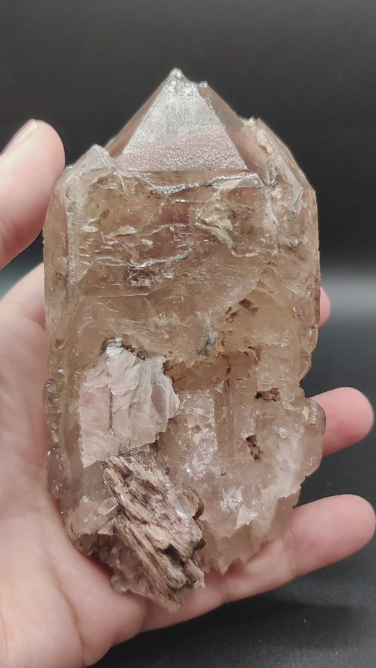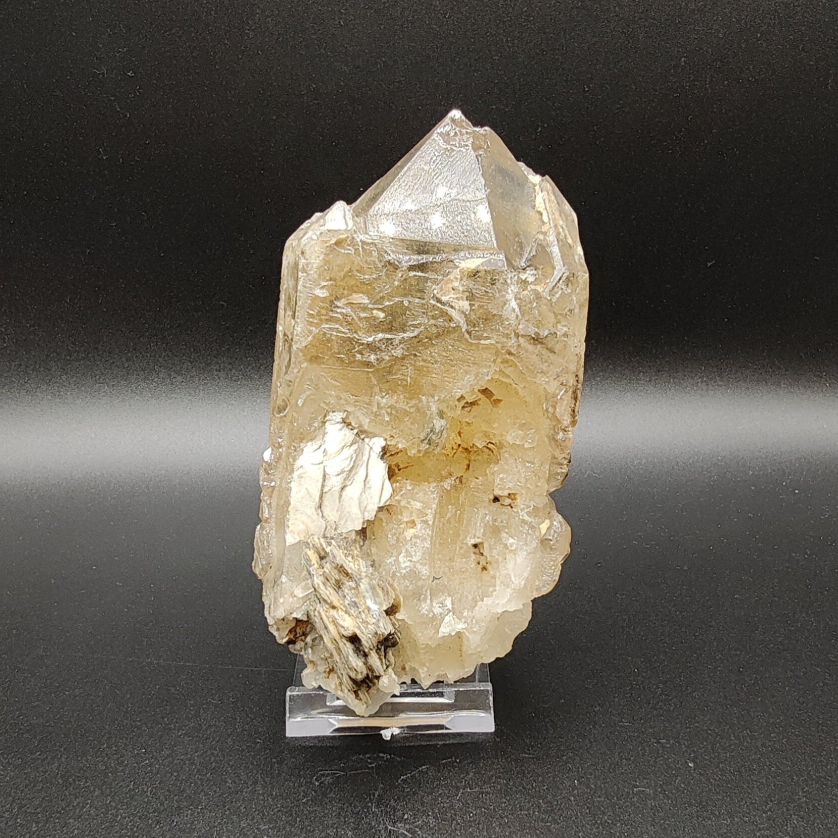 Esta punta con mica moscovita, tiene un color amarillo ahumado y su formación es por capas. Presenta una zona medio corroída por procesos naturales que le confieren una interesante formación.