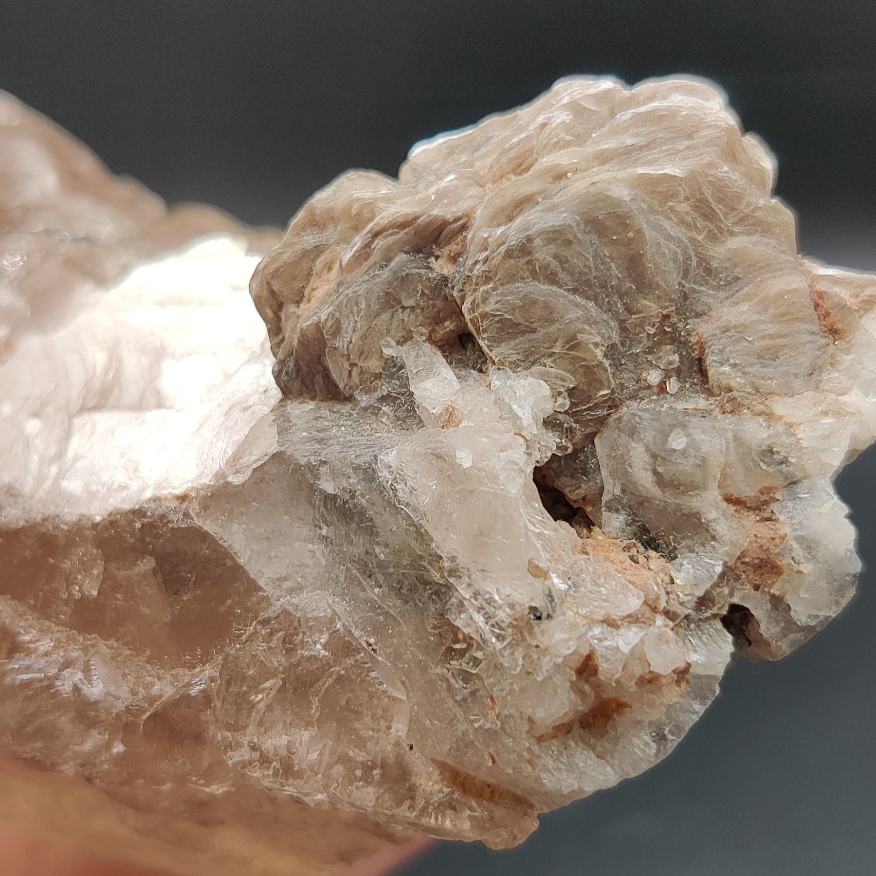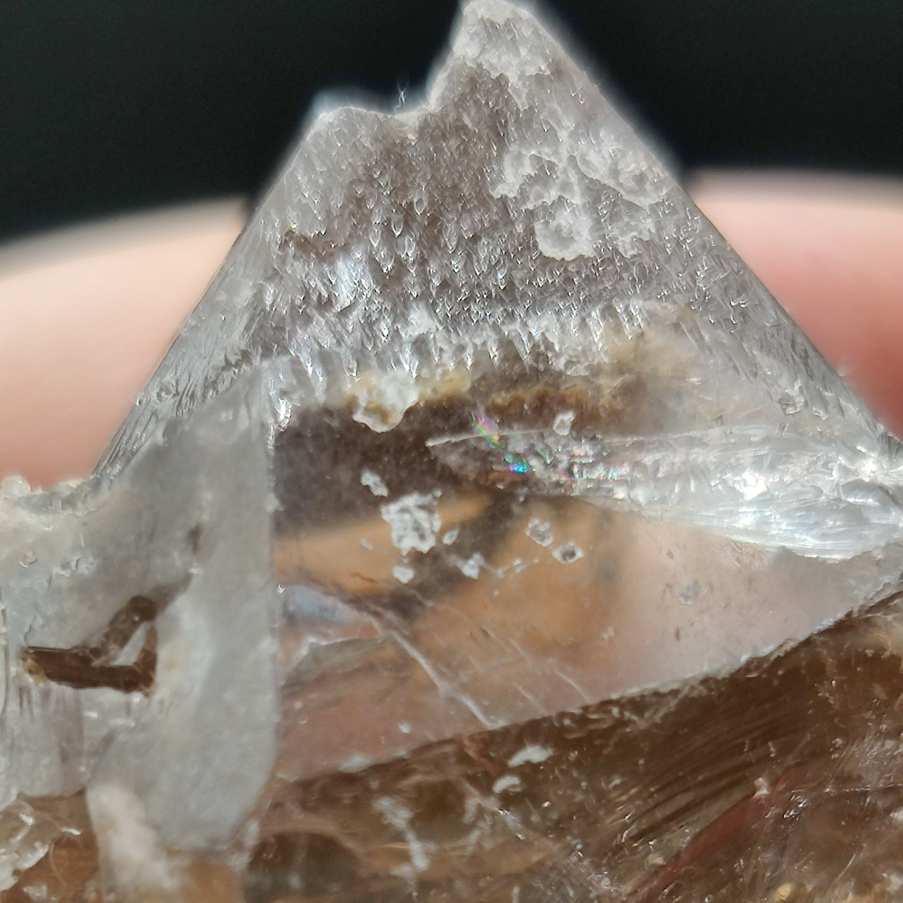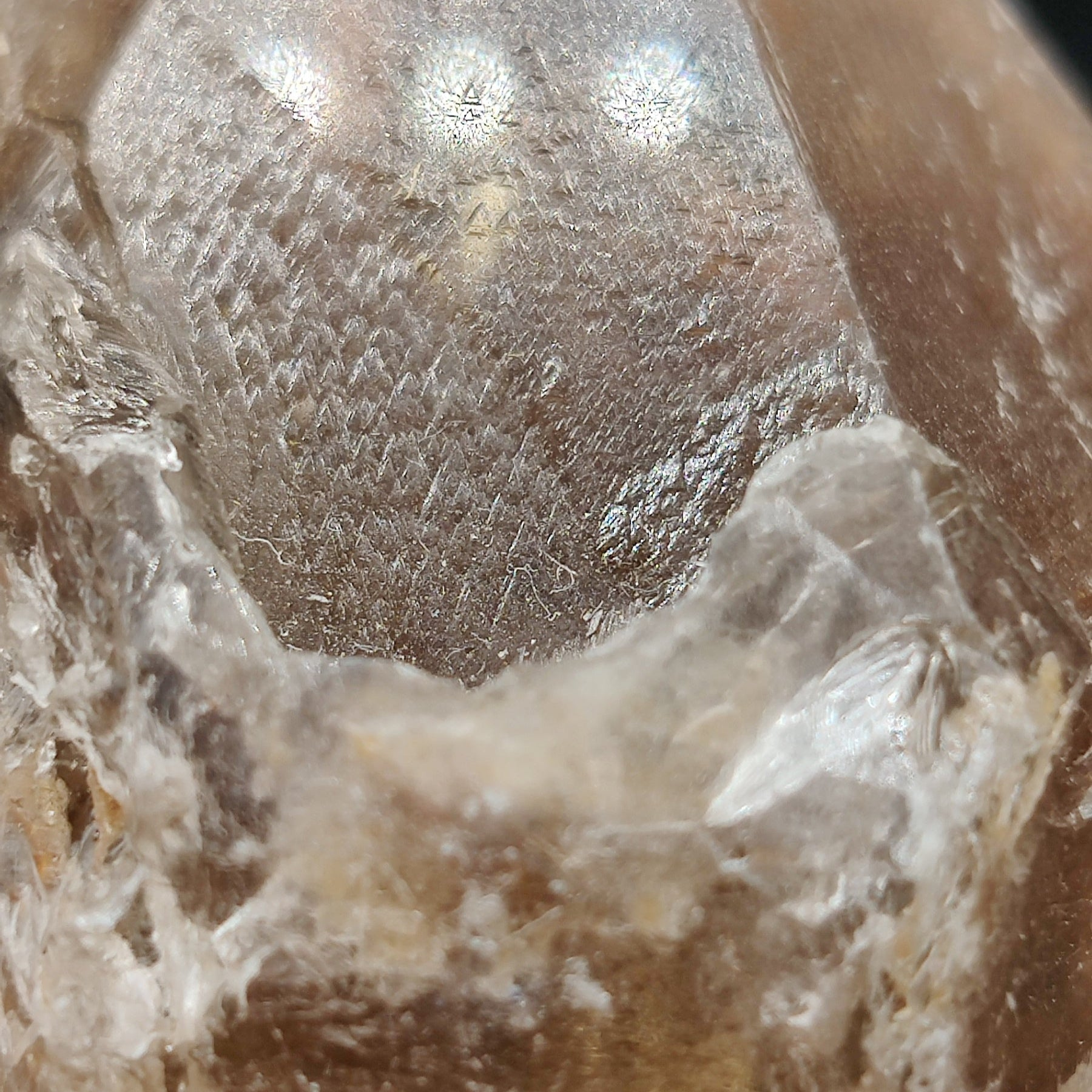 Esta punta con mica moscovita, tiene un color amarillo ahumado y su formación es por capas. Presenta una zona medio corroída por procesos naturales que le confieren una interesante formación.