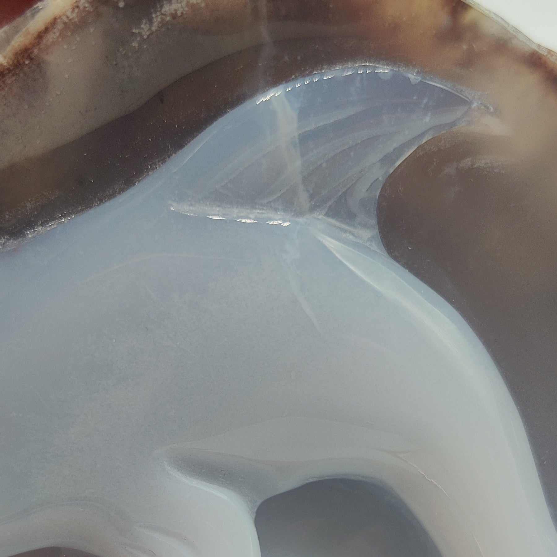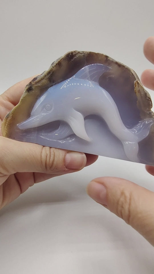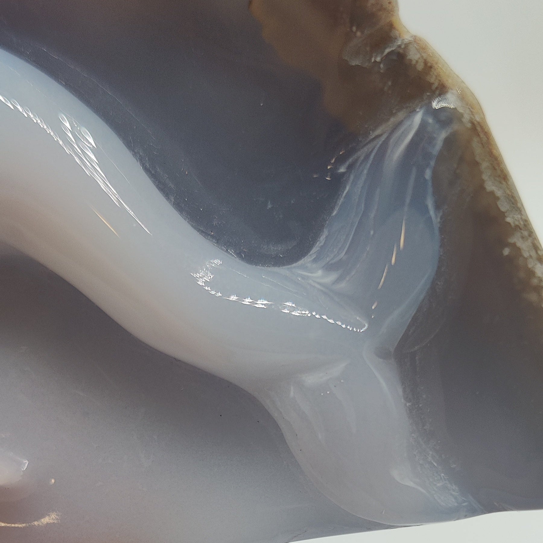 Figura tallada a mano en calcedonia azul con la propia parte externa del nódulo pulido.