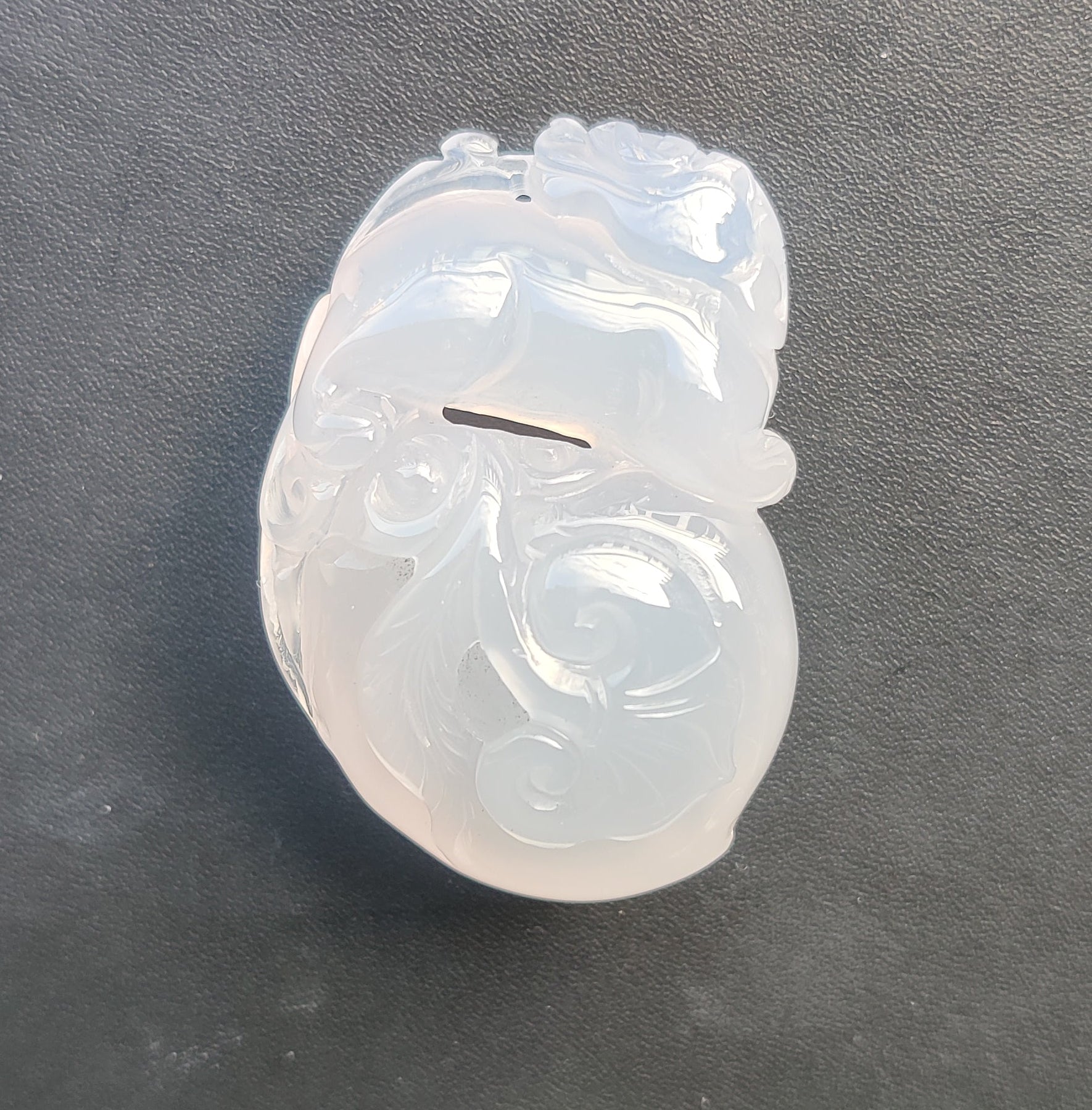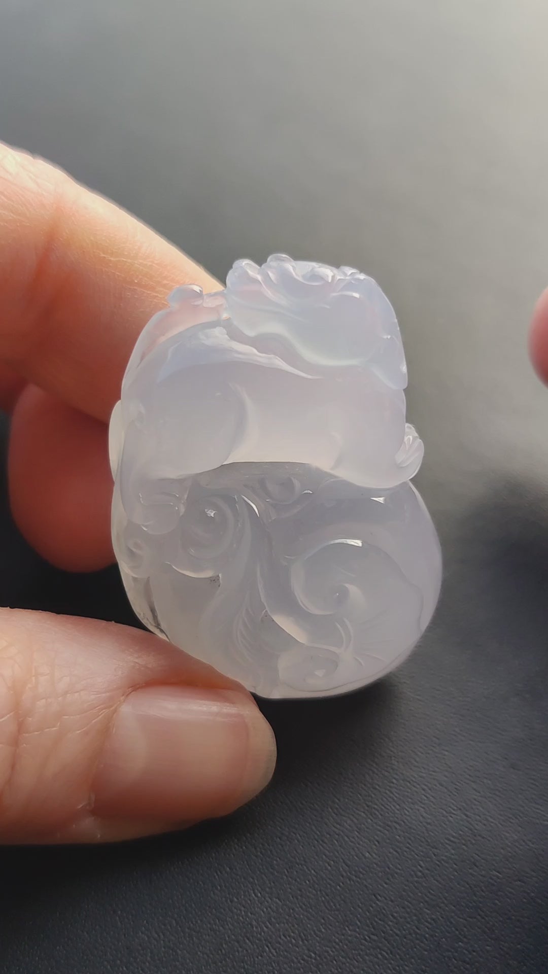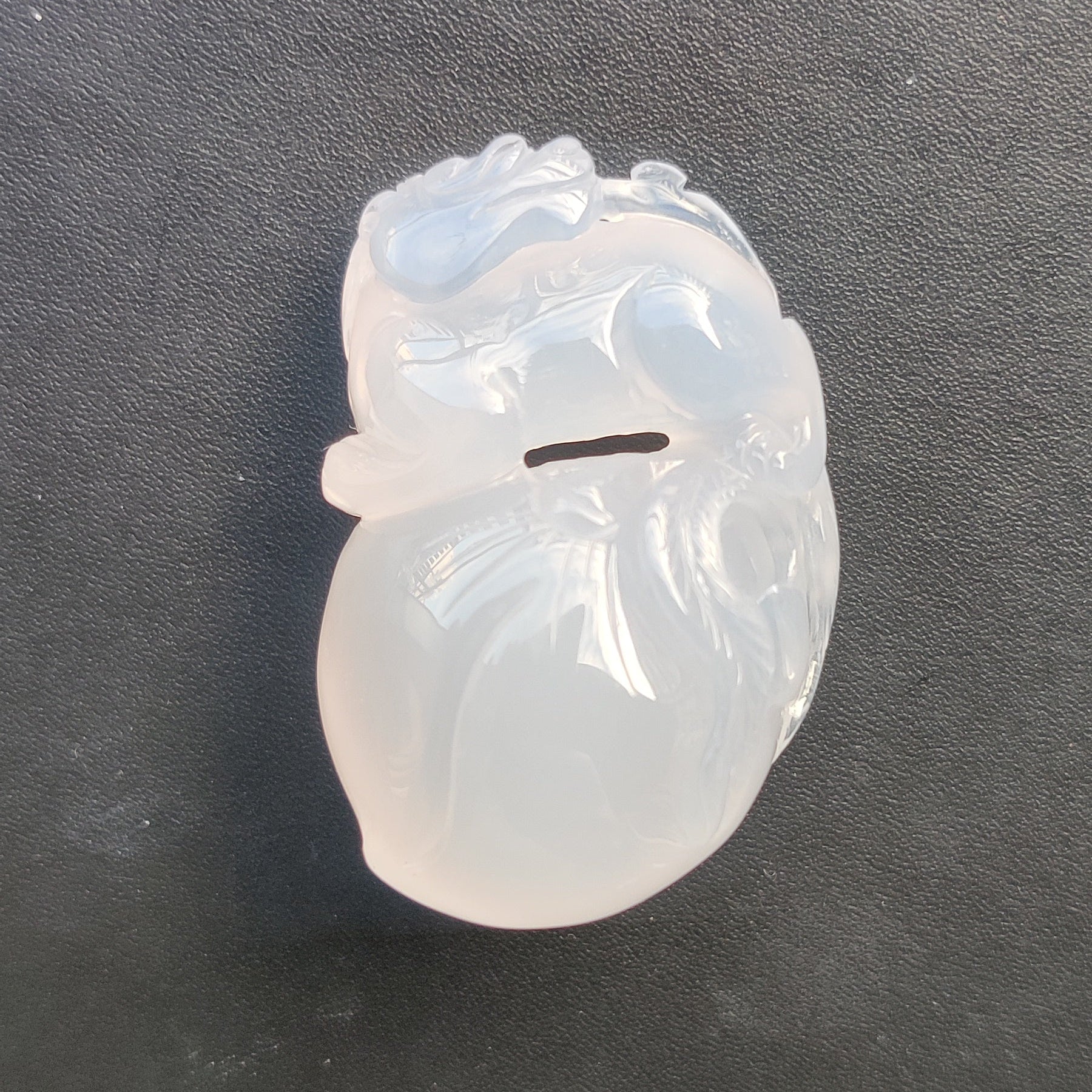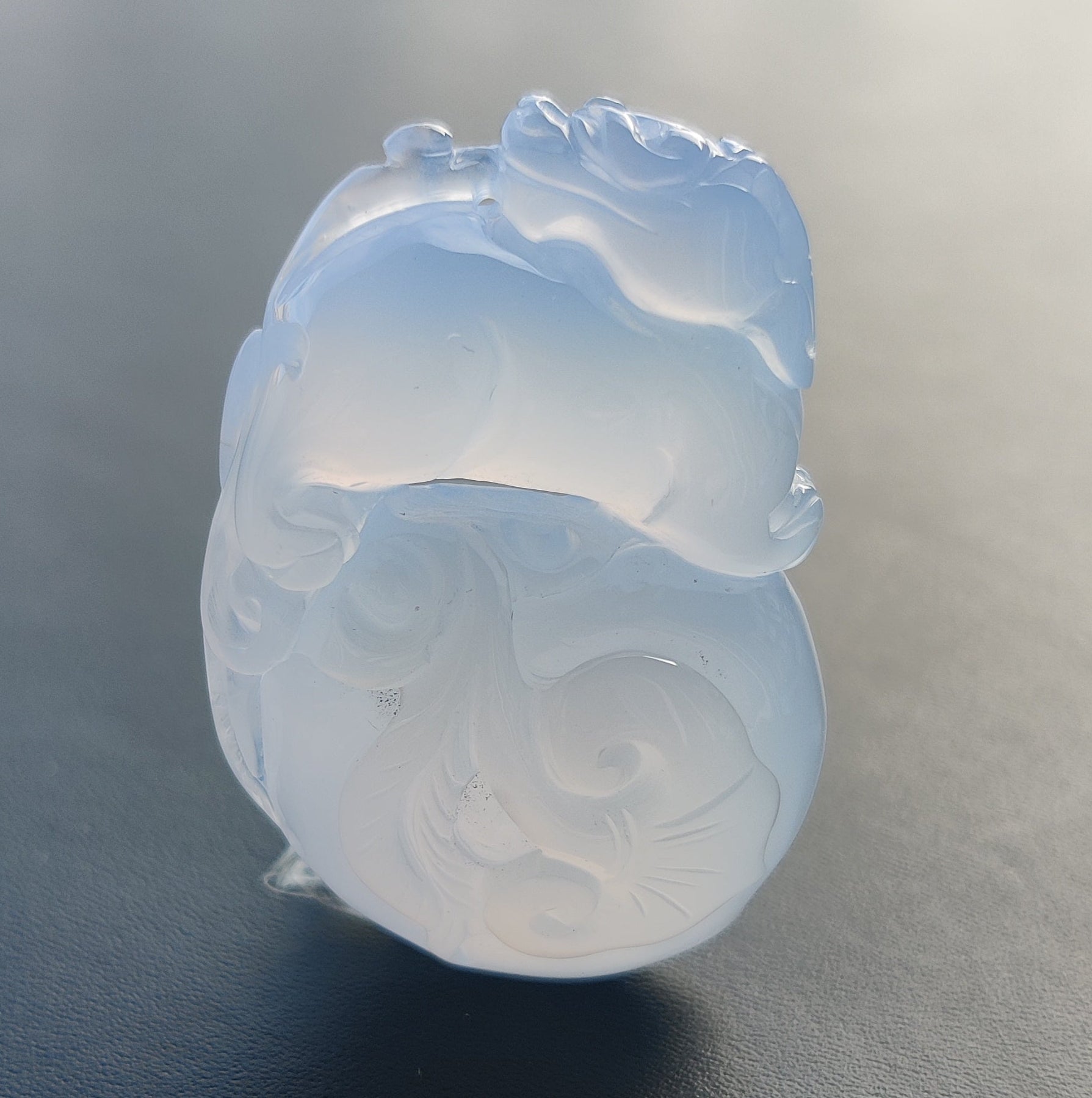 Trabajo fino y delicado, color azul clarito , translúcido, típico de esta Calcedonia de color natural.