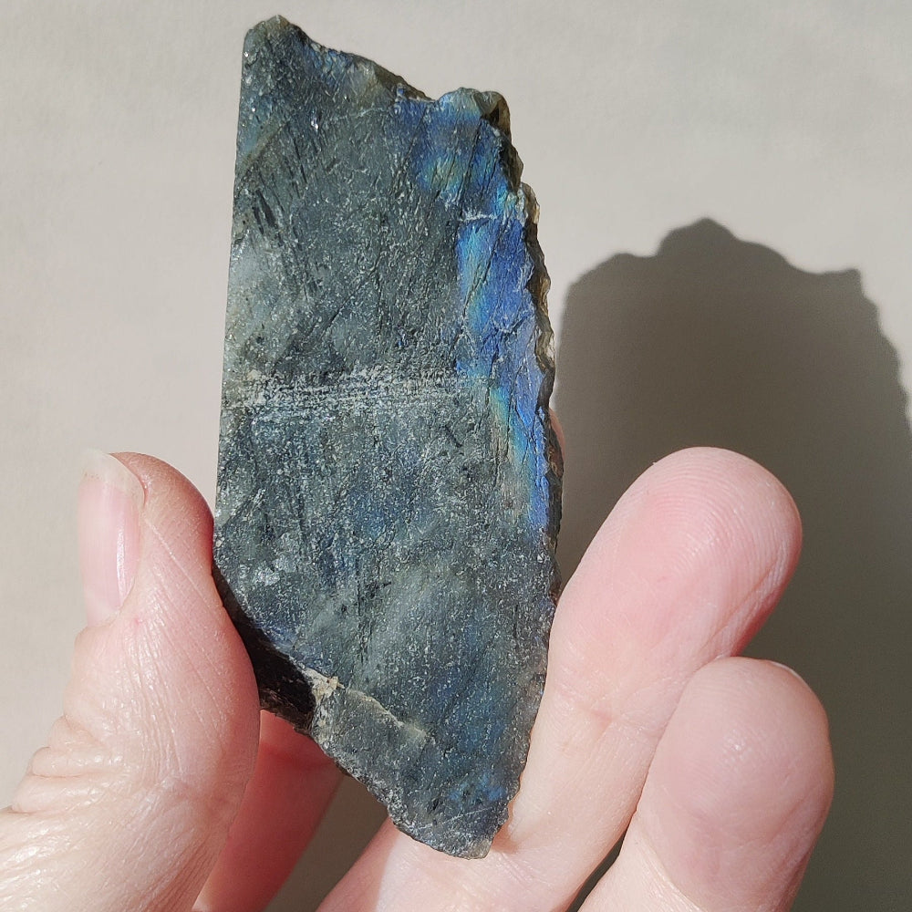 Placa de labradorita pulida por una cara y en bruto por la otra.