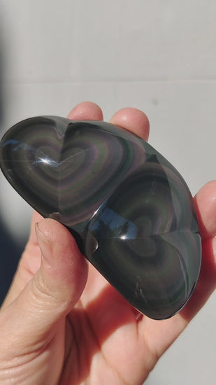 OBSIDIANA ARCOÍRIS pulida en forma de doble corazón.