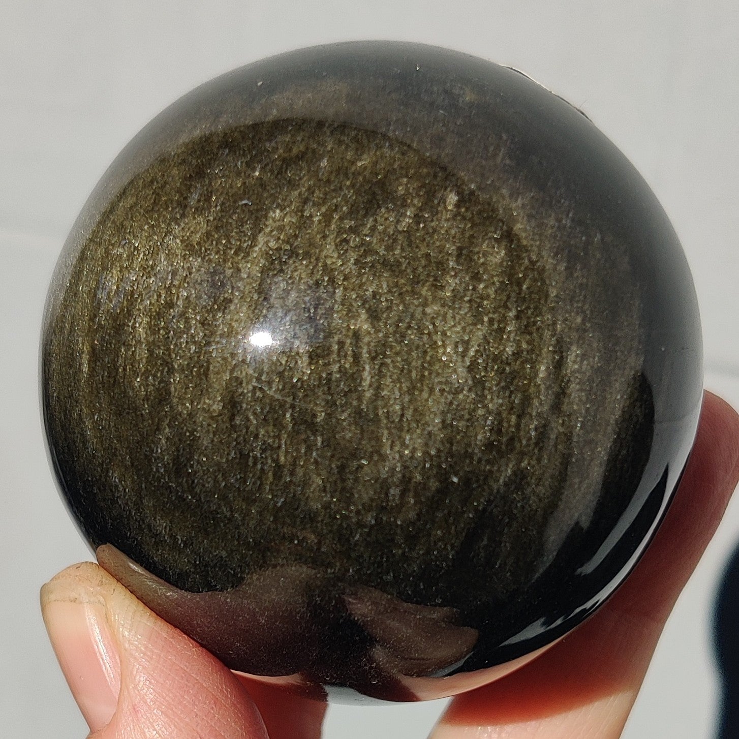 En esta preciosa bola de OBSIDIANA DORADA, podemos observar muy bien el efecto que producen las inclusiones en su interior, produciendo un efecto aterciopelado.