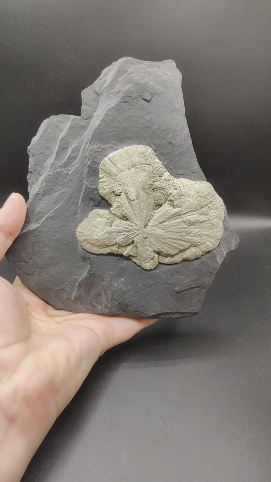 Este ejemplar presenta una matriz negra con una pirita sol irregular, completa y brillante.