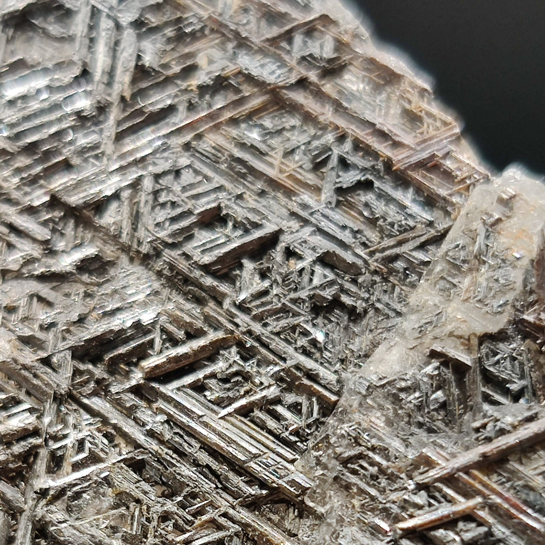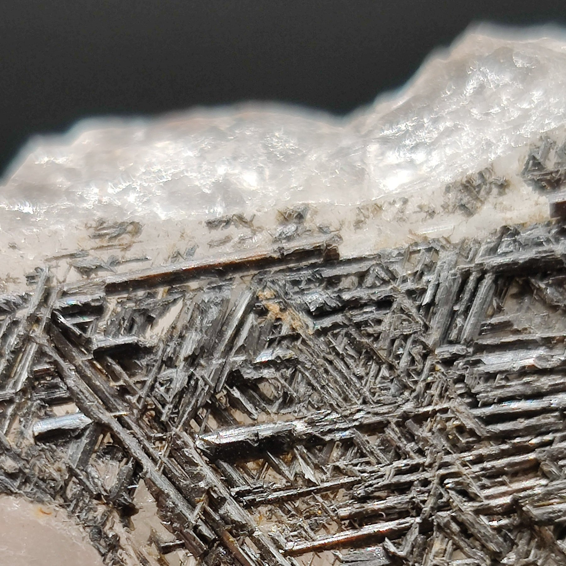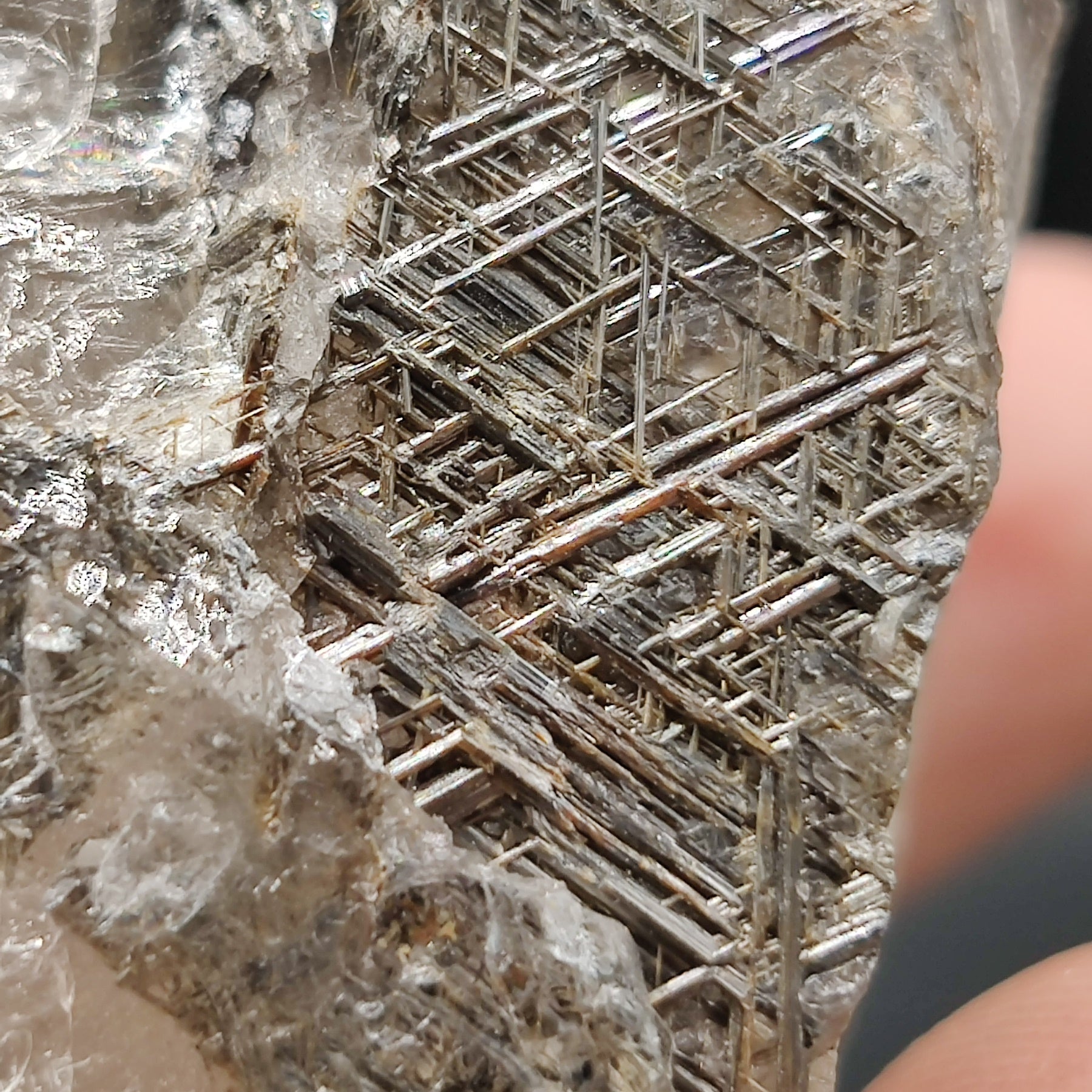 Rutilo cristalizado en forma de red (cristales gemelos) sobre matriz de cuarzo transparente.